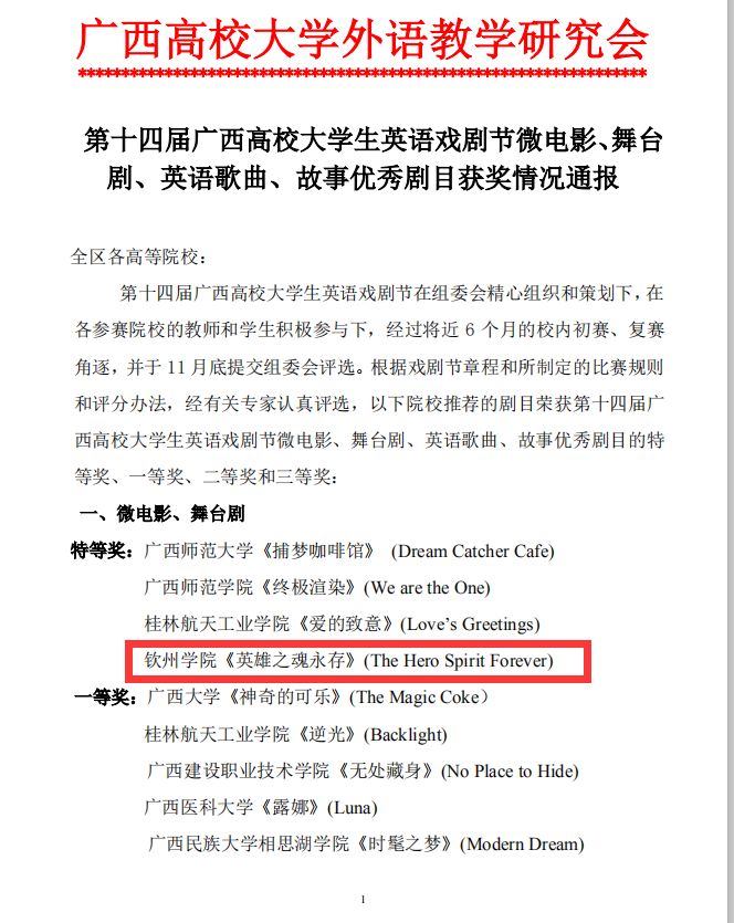 近日,beat365官网选送的《英雄之魂永在》《交错的星空》两部作品在第十四届广西高校大学生英语戏剧节微电影、舞台剧大赛中分获特等奖和一等奖。beat365官网作品立足本地历史和国际化,选送的《英雄之魂永在》(The Hero’s Spirit Forever)讲述民族英雄刘永福将军的英勇事迹。《交错的星空》(Intertwined Youth)讲述非洲留学生和中国学生从文化冲突到文化融合的故事。其中,《英雄之魂永在》作为三部精选作品之一,在“广西高校大学外语...