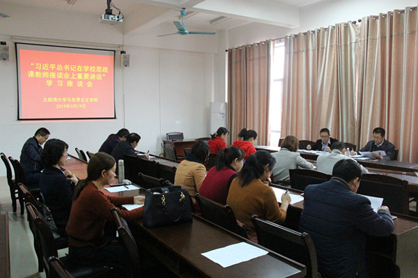 3月19日下午,马克思主义学院在3-401会议室召开“习近平总书记在学校思政课教师座谈会上重要讲话”学习座谈会。马院专兼职教师参加学习座谈,广西英华国际职业学院思政部主任梁淳一和教师代表应邀参会。会议由马克思主义学院院长陈锋主持。会上,与会人员观看了“习近平总书记在学校思政课教师座谈会上重要讲话”视频,并就习总书记的重要讲话精神谈谈个人学习心得体会。与会教师纷纷表示要牢记习总书记对思政教育、思政课教...