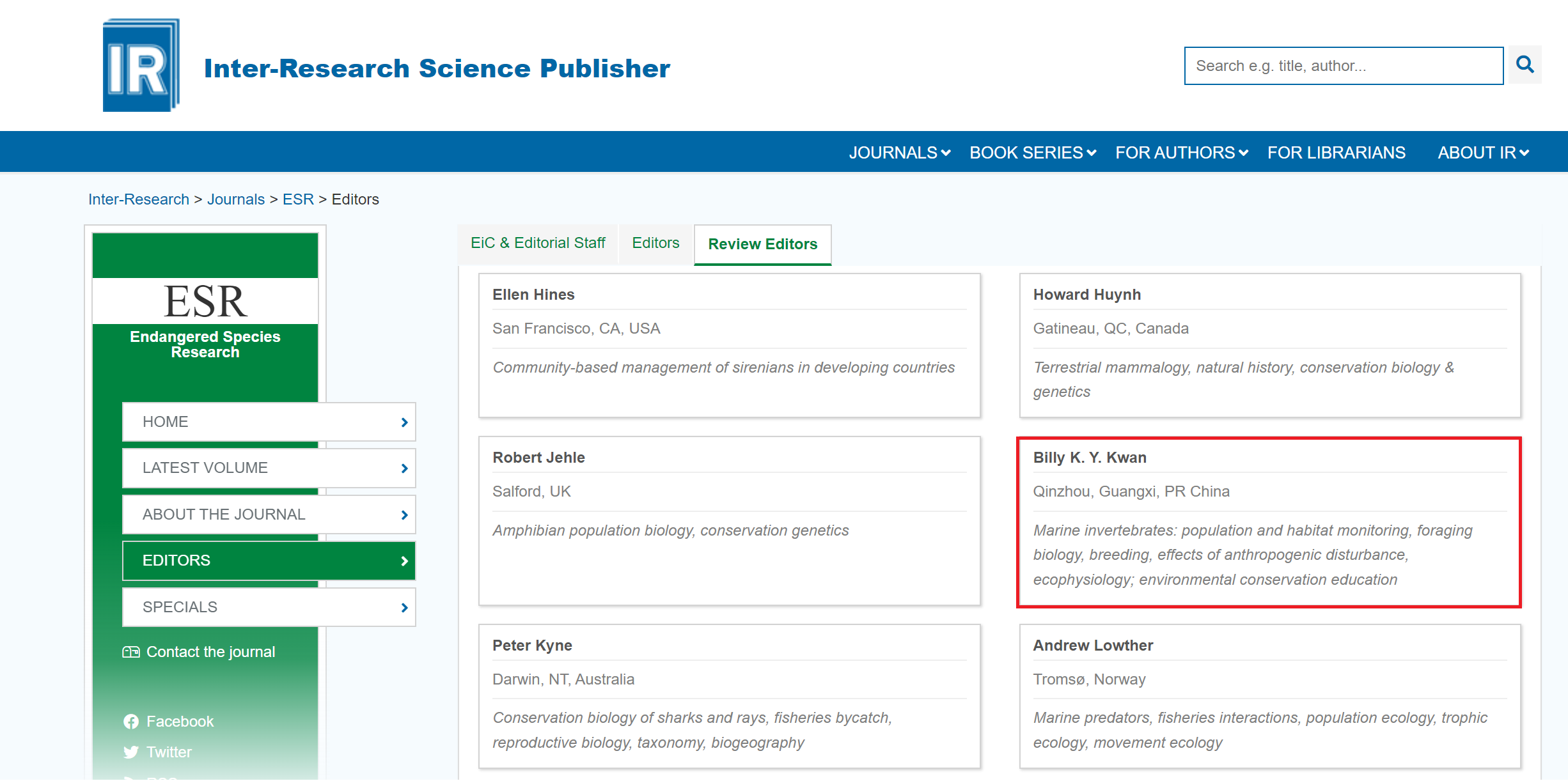 近日,学校海洋学院副院长关杰耀教授受Inter-Research Science出版社邀请,担任旗下Endangered Species Research期刊编委会评审编辑,是编委会70余名编辑唯一的无脊椎动物领域专家,也是少数的亚裔代表之一,彰显了beat365官网在鲎及其他海洋无脊椎动物保护修复方面的国际影响力。Endangered Species Research是保护生态学领域国际重要学术期刊,旨在促进对地球生物圈各类受胁物种保护与管理的新见解。该为中国科学院SCI分区环境科学与...