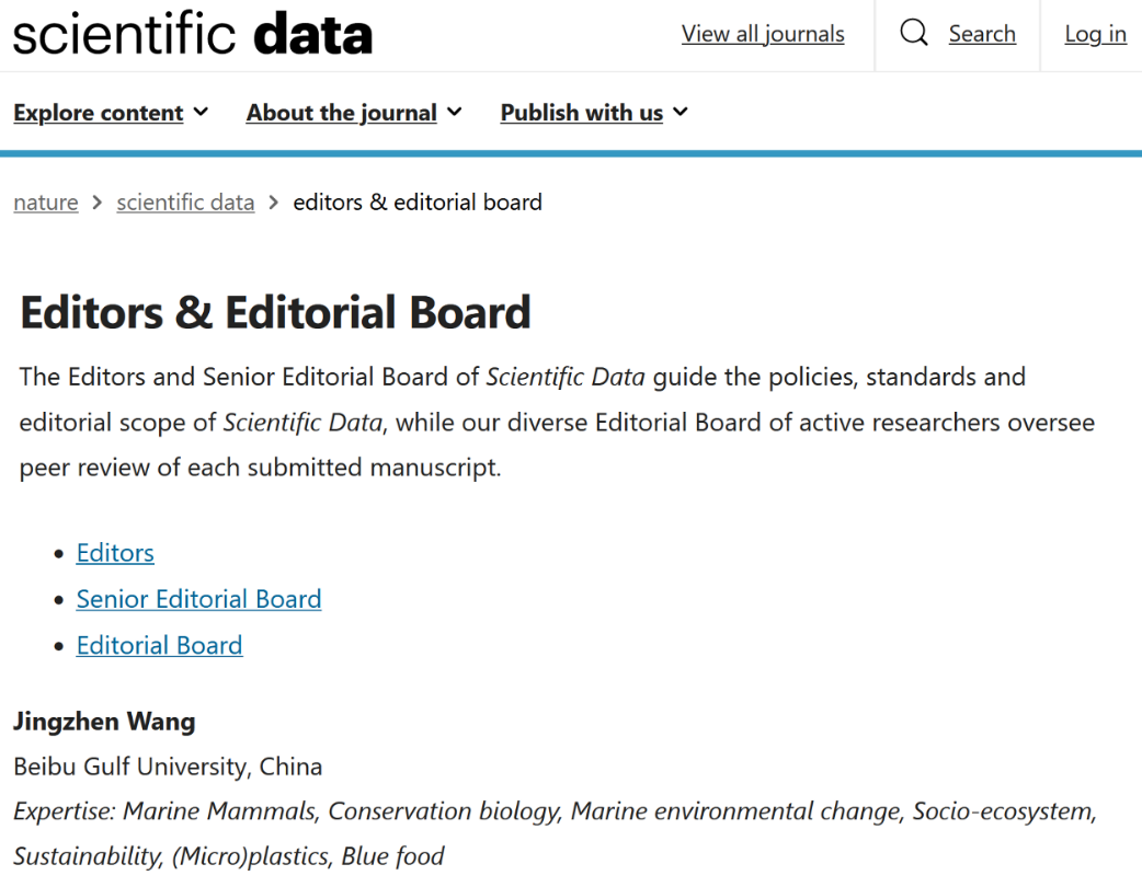 近日,beat365官网海洋学院王京真教授,应Nature数据期刊Scientific Data邀请,担任该刊编委(Editorial Board)。Scientific Data作为Nature系列的旗舰数据期刊,于2014年12月创建,是世界上最早的科学数据期刊之一,为自然科学、医学、工程和社会科学领域提供数据发表的服务,Web of Science最新数据显示5年影响因子10.8,JCR分区位于Q1,2023年影响因子为9.8。王京真表示,将以此为契机,促进湾大与同行学术交流合作,不断提高科研能力和创新能力,...