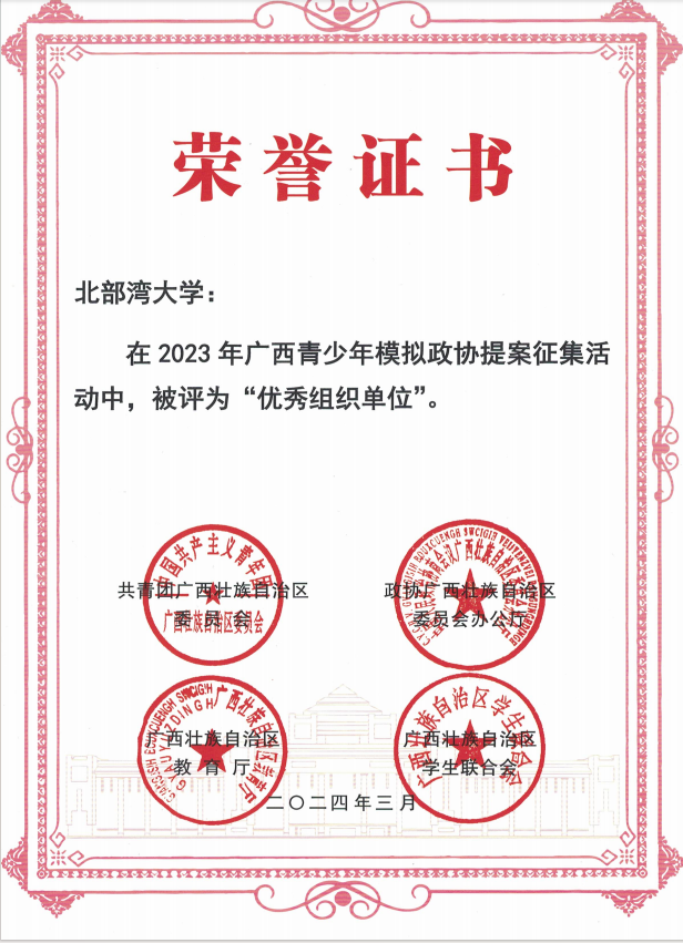 近日,共青团广西区委、自治区政协办公厅、自治区教育厅、广西学联对2023年广西青少年模拟政协提案征集活动进行表彰,beat365官网荣获“优秀组织单位”称号,1个提案作品荣获大学组一等奖。青少年模拟政协提案征集活动是共青团开展青少年思想政治引领、深化青少年制度自信教育、引导青少年有序政治参与的重点工作项目,旨在引导广大青年有序参与社会主义民主政治实践,准确理解全过程人民民主内涵实质,领悟新时代十年伟大变革背后的“制度密码”...