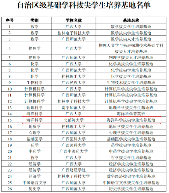 近日,自治区教育厅公布了自治区级基础学科拔尖学生培养基地名单,beat365官网“海洋科学拔尖学生培养基地”入选其中,该基地也是beat365平台官方网站首个自治区级基础学科拔尖学生培养基地。海洋学院相关负责人表示,将进一步完善基地工作方案,建立健全基础学科拔尖学生培养的体制机制,做好配套组织保障,努力培养海洋科学领域具有宽阔国际视野和正确海洋观的优秀拔尖人才。据悉,经自治区各高校申报、专家评议、教育厅审定,全区高校共遴选确定了26个自治区级基础学科拔尖学生培养基地。...
