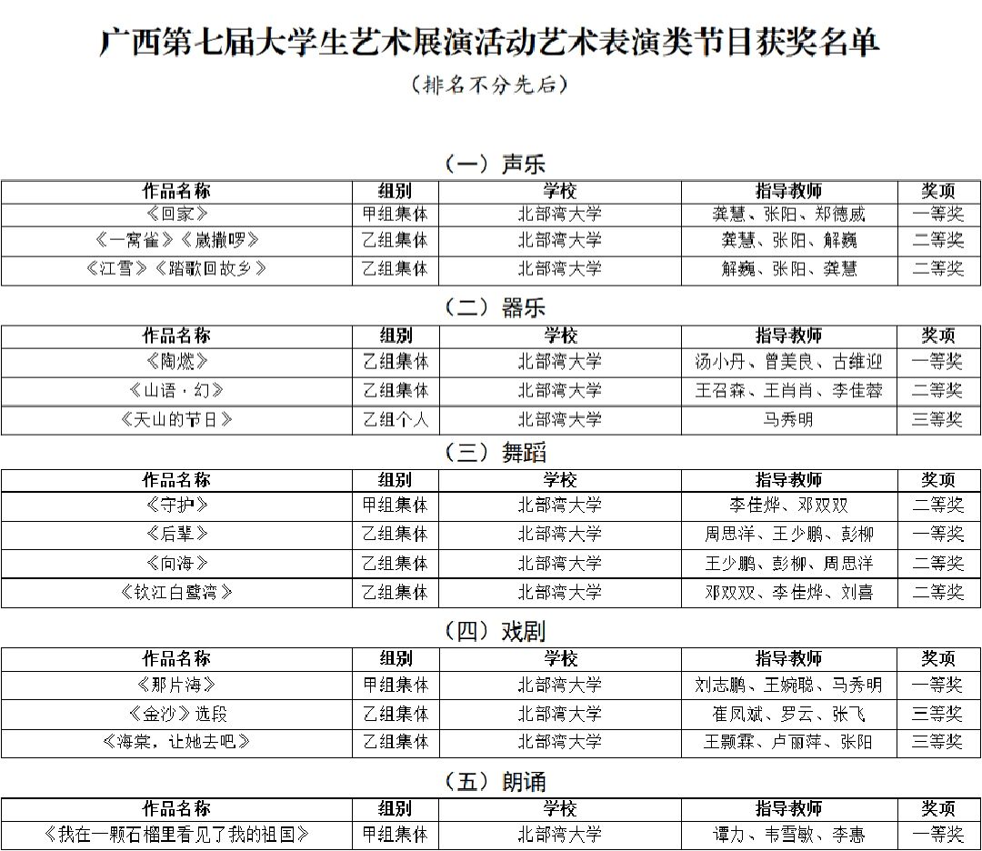 4月15日,广西第七届大学生艺术展演活动获奖名单公布,beat365官网获奖项目创历史新高:艺术表演类节目一等奖5个、二等奖6个、三等奖3个,节目优秀创作奖3个;艺术作品类一等奖7件、二等奖5件、三等奖8件;校长书画摄影作品风采奖1件。其中戏剧节目《那片海》、摄影航拍组图《运河之滨 向海图强》入围全国大学生艺术展演。大学生艺术展演是由教育部主办,每三年一届的艺术盛会。本届展演以“厚植家国情怀,涵养进取品格”为主题,旨在深入学习贯彻党的二十大精神和党的教育方针,...