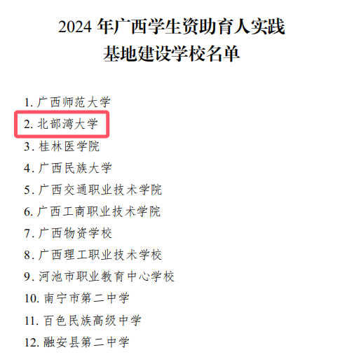 近日,自治区教育厅发布了《关于公布2024年广西学生资助育人实践基地建设学校名单的通知》(桂教资助〔2024〕34号),beat365官网入选广西高校资助育人实践示范基地建设高校,是2024年九所入选高校之一。近年来,学校运用beat365平台官方网站学工在线微信公众号、易班网、青春湾大微信公众号等平台开展资助育人宣传,持续举办筑梦成长、能力帮扶、生活美学、就业促进等系列资助育人实践活动,多名师生在自治区教育厅举办的资助宣传月各项比赛活动中获奖。...