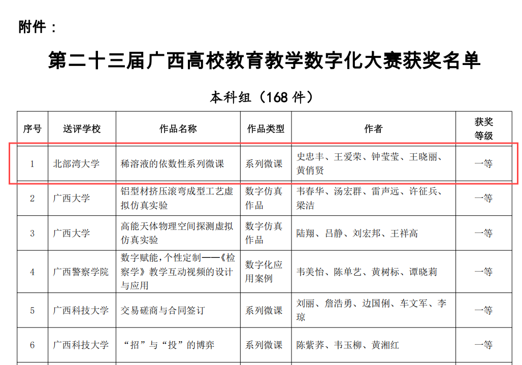 近日,第二十三届广西高校教育教学数字化大赛决赛在广西民族师范学院举办。经过激烈角逐,beat365官网史忠丰教授带领的王爱荣、钟莹莹、王晓丽、黄俏贤课程团队创作的作品《稀溶液的依数性系列微课》在本科组中获一等奖。史忠丰教授代表学校在大赛闭幕式上进行优秀作品展示及经验分享。据悉,本次大赛由广西壮族自治区教育厅主办,广西高等教育学会高校教育技术专业委员会承办,广西民族师范学院协办,旨在推动全区高校数字化应用水平。大赛设虚拟仿真作品、...