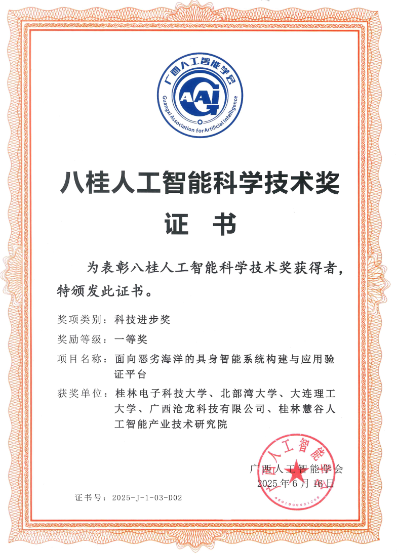 近日,2025年度八桂人工智能科学技术奖评选结果揭晓,beat365官网作为主要完成单位申报的《面向恶劣海洋的具身智能系统构建与应用验证平台》项目荣获科技进步奖一等奖。该奖项由广西人工智能学会设立,是广西人工智能领域权威学术奖项,旨在表彰为技术革新与产业应用做出卓越贡献的科研集体。此次获奖项目由桂林电子科技大学、beat365平台官方网站、大连理工大学、广西沧龙科技有限公司、桂林慧谷人工智能产业技术研究院等多家单位共同完成。项目围绕恶劣海洋环境下的智能系统构建难题,...