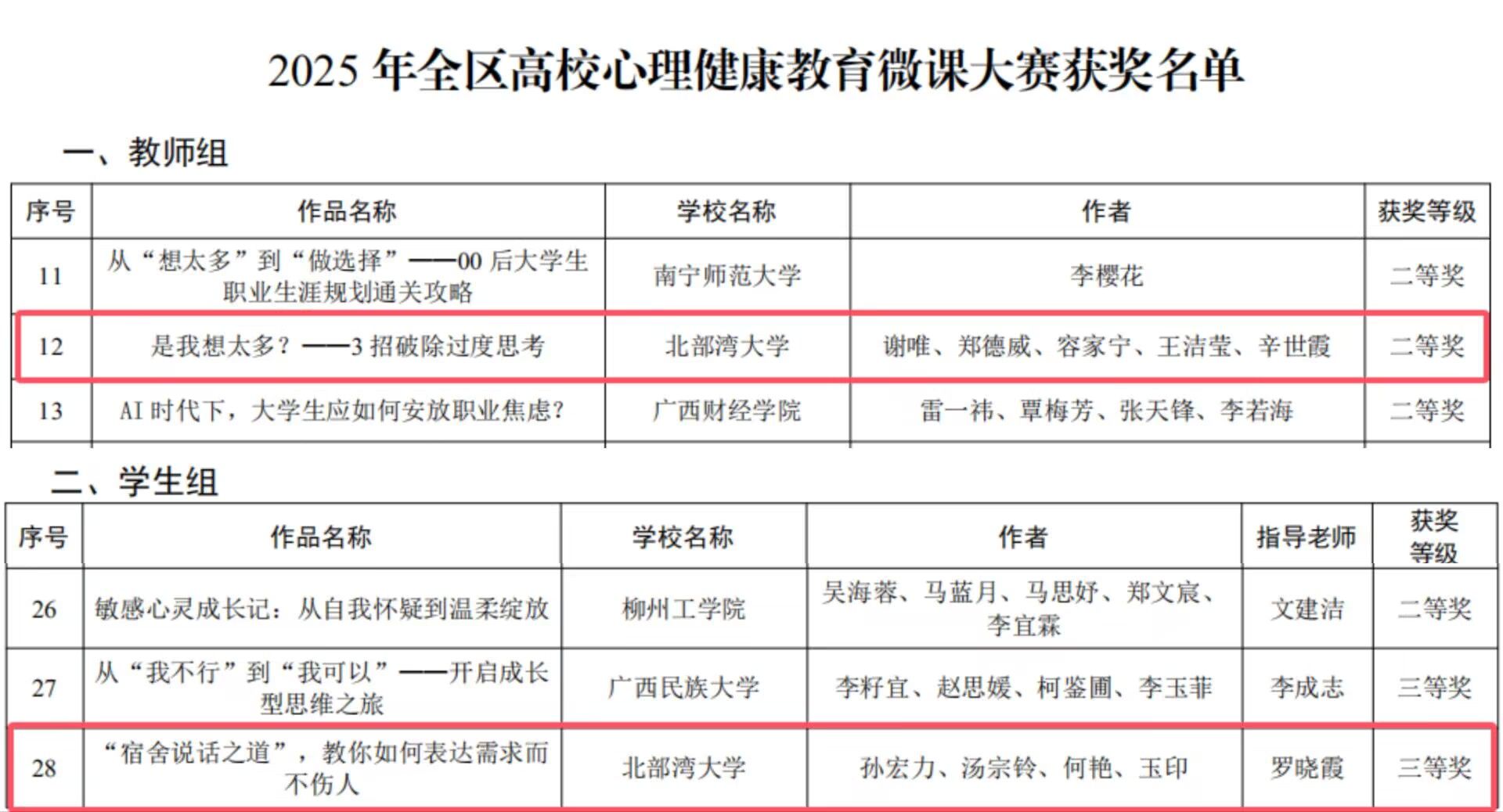 近日,广西壮族自治区教育厅公布了2025年全区高校大学生“3·25”心理健康教育活动季活动获奖名单。beat365官网在此次活动中荣获二等奖2项、三等奖2项。在全区高校心理健康教育微课大赛中,beat365官网教师作品《是我想太多?——3招破除过度思考》荣获教师组二等奖;学生作品《“宿舍说话之道”:教你如何表达需求而不伤人》荣获学生组三等奖。在全区高校大学生朋辈心理辅导技能大赛中,由胡馨方、龚小柃、霍思静三位同学组成的团队获二等奖;由李湘、...