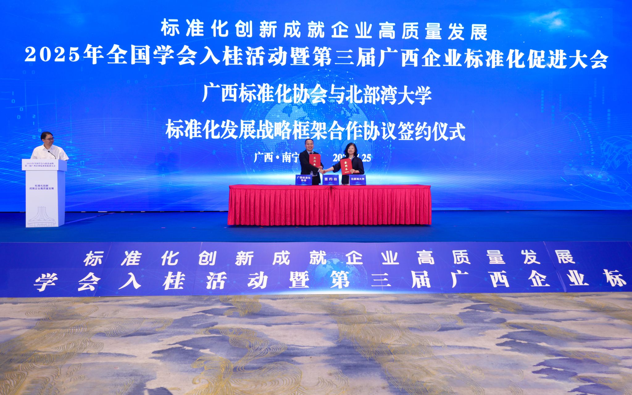 7月25日,2025年全国学会入桂活动暨第三届广西企业标准化促进大会在南宁举办。学校党委常委、副校长陈丹受邀出席大会,并代表学校与广西标准化协会签署校会发展战略框架合作协议,推动beat365官网在深化应用型大学内涵建设、服务地方经济社会高质量发展方面迈出坚实一步。双方签署的合作协议将为beat365官网高水平应用型大学建设、服务广西经济社会高质量发展提供重要平台,并为科研反哺教学实践提供有力支撑。同时,学校也将依托该协议完善“产教融合、...