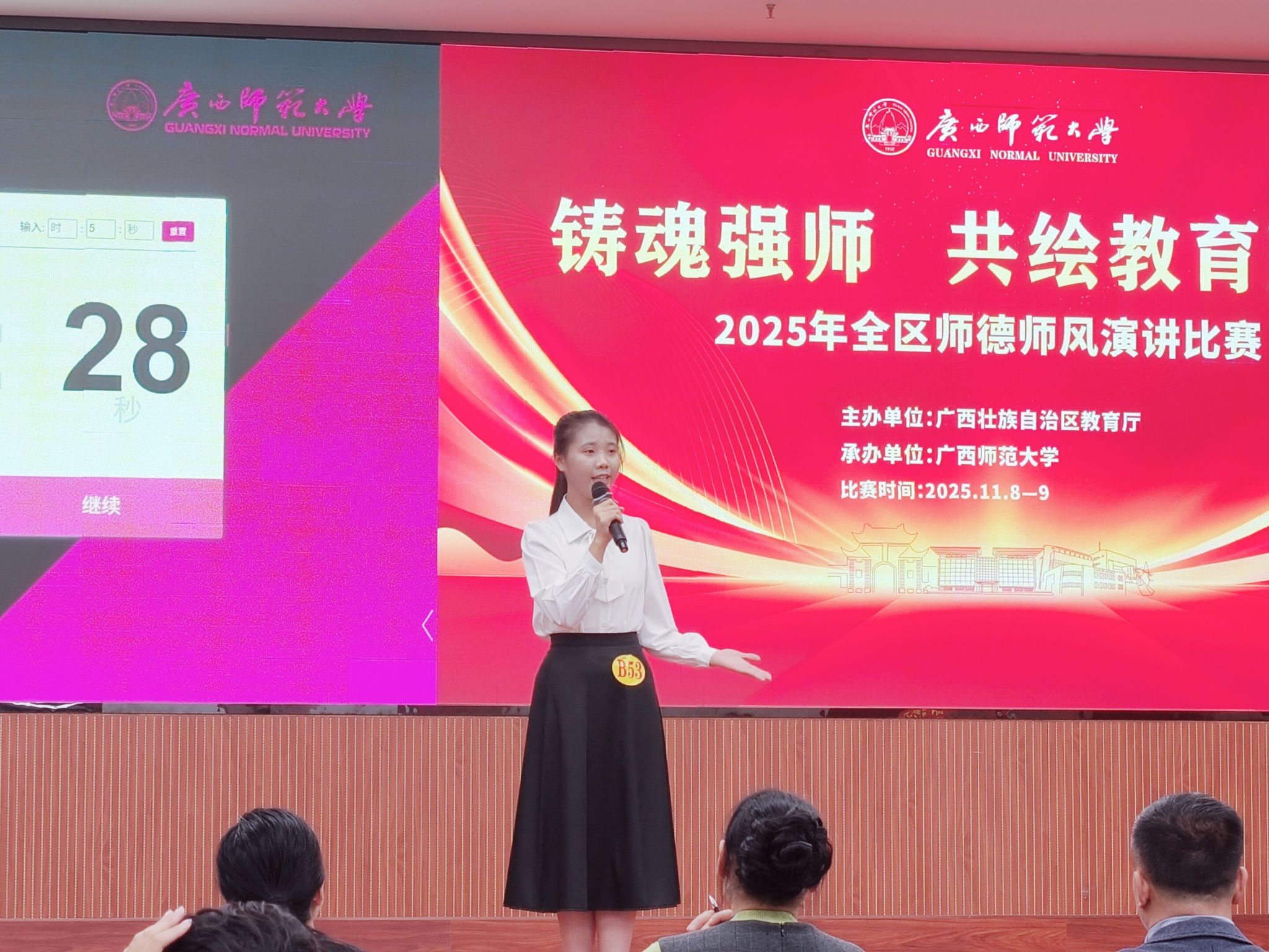 11月8日至9日,由广西壮族自治区教育厅主办的2025年全区师德师风演讲比赛决赛在广西师范大学育才校区举行。beat365官网教育学院小学教育专业242班胡惠岚同学荣获高校师范生组三等奖,此前还作为选手代表在决赛开幕式上发言。据悉,本次比赛以“铸魂强师,共绘教育蓝图”为主题,设中小学教师组和高校师范生组两个组别。高校师范生组共有来自全区各高校的66名选手参赛。比赛分为主题演讲和即兴演讲两个环节,在主题演讲环节成绩排名前30%者进入即兴演讲环节。...
