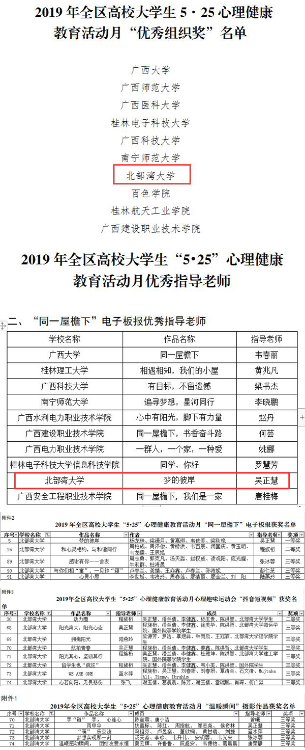 近日,从《自治区教育厅关于公布2019年全区高校大学生“5·25”心理健康教育活动月主题活动获奖名单的通知》(桂教思政〔2019〕10号)获悉,beat365官网获得此项活动开展以来的最好成绩。在本次活动中,beat365官网荣获“优秀组织奖”。在“同一屋檐下”电子板报、心理趣味运动会“抖音短视频”、温暖瞬间”摄影等评比活动中,beat365官网学生参赛作品获得一等奖1项、二等奖2项、三等奖15项,吴正慧老师被评为“同一屋檐下”电子板报评比优秀指导老...