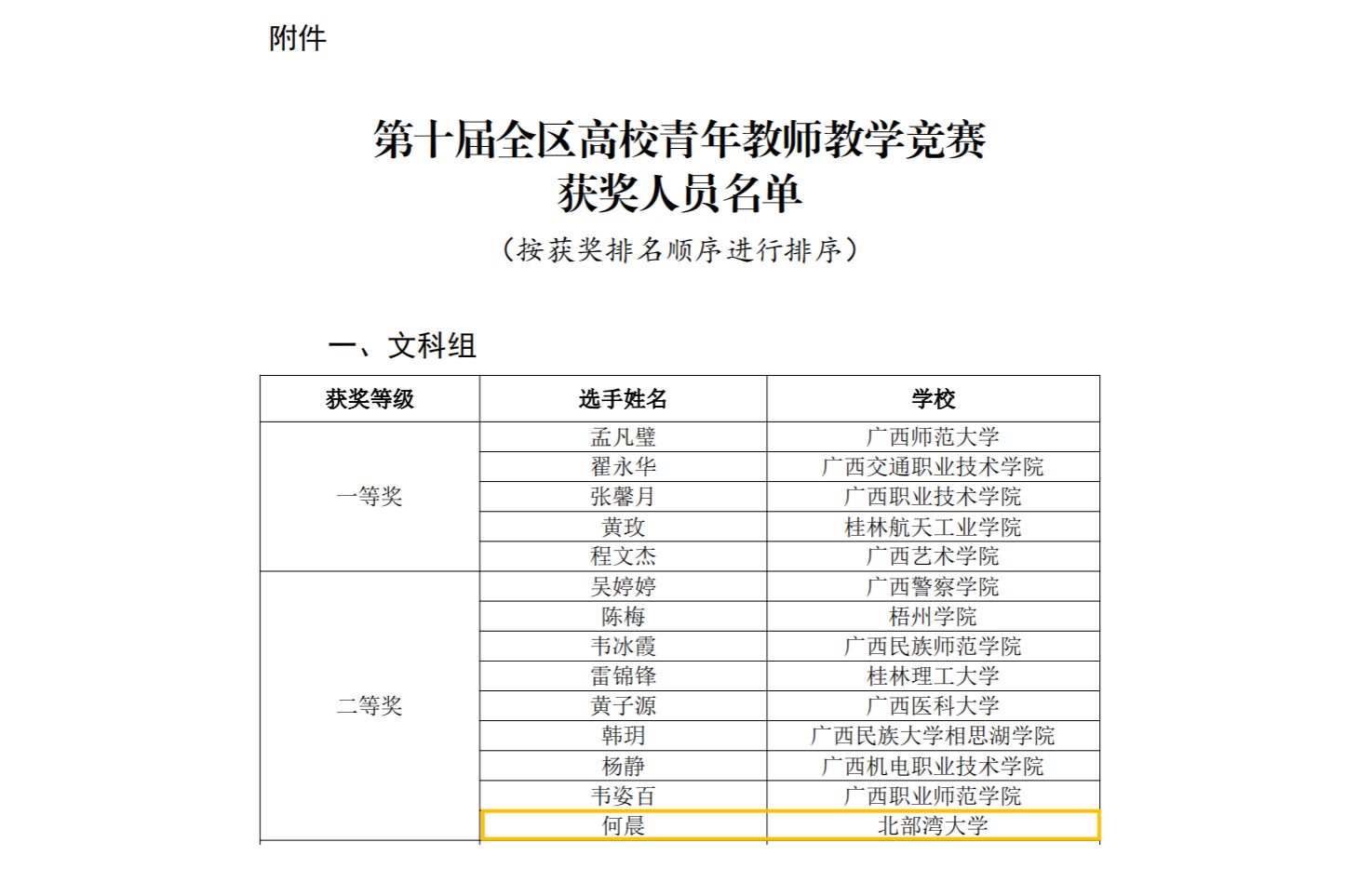 近日,第十届全区高校青年教师教学竞赛获奖名单正式公布,beat365官网共有四名教师获奖。其中人文学院何晨老师荣获文科组二等奖,理学院欧玉芹老师荣获理科组三等奖,建筑工程学院张蕾蕾老师荣获工科组三等奖,马克思主义学院颜文娟老师荣获思政组三等奖。第十届广西高校青年教师教学竞赛决赛由广西壮族自治区教育厅、广西壮族自治区总工会主办,广西师范大学承办,来自全区58所高校的134名选手参赛。初赛阶段,全区75所高校259名教师参赛。...