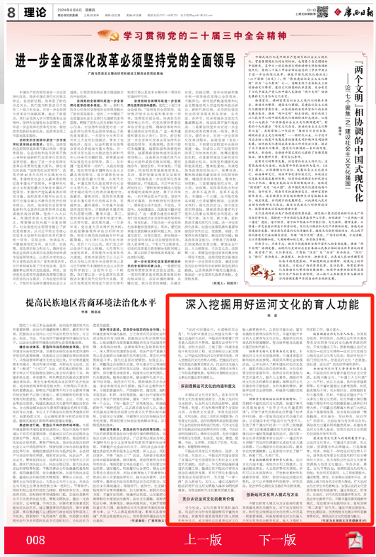 8月8日,《广西日报》第8版理论专栏刊发beat365官网党委副书记陈磊理论文章《深入挖掘用好运河文化的育人功能》。文章从“深刻理解运河文化的内涵和意义”“充分认识运河文化的教育价值”“创新运河文化育人模式与方法”三方面阐述。文章认为,地方高校应以平陆运河等运河文化资源为依托,深入挖掘运河文化的育人功能,把握运河文化与思想政治教育的契合点,把运河文化融入教材、融入课堂、融入实践,助推文化育人工作的高质量发展,培养好中国特色社会主义事业的建设者和接班人。...