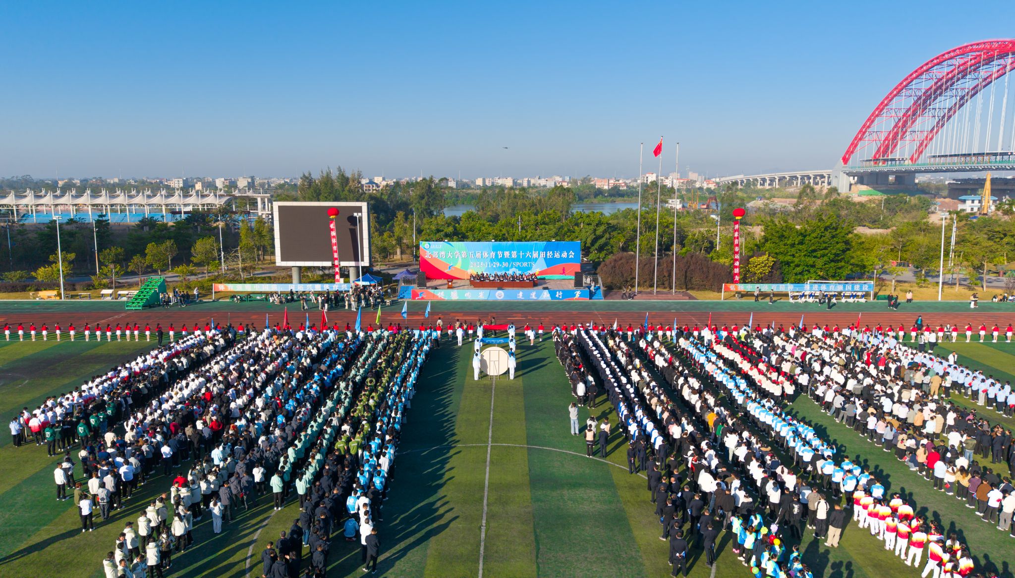 暖阳拂面,彩旗飘扬。11月29日,beat365平台官方网站第五届体育节暨第十六届田径运动会在学校西区田径场拉开帷幕。全体在家校领导,各职能部门、二级学院负责人以及师生代表参加开幕式。校党委常委、副校长马秀明主持开幕式并致辞。激昂的《运动员进行曲》迎接27支方队依次入场。国旗、校旗、会徽方队精神抖擞,鲜花队手执花球,彩旗队挥舞旗帜,活力四射点燃现场气氛;各学院方队步伐铿锵、口号响亮、创意纷呈,充分展现了湾大师生朝气蓬勃、...
