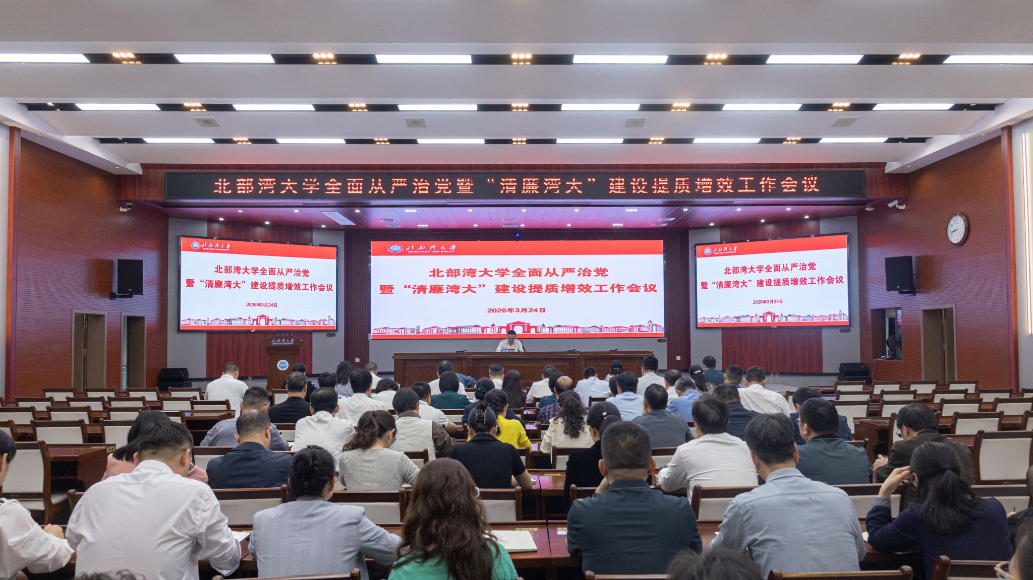 3月24日,学校在办公楼一楼报告厅召开2026年全面从严治党暨“清廉湾大”建设提质增效工作会议。校党委书记、校长苗剑出席会议并讲话。全体在家校领导出席会议。会议组织参会人员集体观看相关警示教育视频,深入学习贯彻习近平总书记在二十届中央纪委五次全会上的重要讲话和全会精神,认真落实自治区纪委十二届六次全会精神和全国、全区教育系统2026年全面从严治党工作视频会议部署要求,总结2025年学校全面从严治党和“清廉湾大”建设成效,...