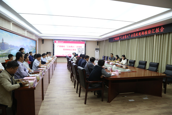 11月8日上午,全区高校“三全育人”示范校现场核验工作汇报会在办公楼523召开。检查组组长周丽华,成员王宇清、韦德强,校党委书记赵君、副书记陈湘如出席会议。会上,赵君代表学校向检查组汇报了学校“三全育人”工作开展情况。他指出,学校在开展“三全育人”工作中突出产教融合背景下“三全育人”工作的创新,探索了校地企合作“三全育人”的新路径;突出了育人机制和平台创新,对开展大学生“课程思政”进行了新的探索;...