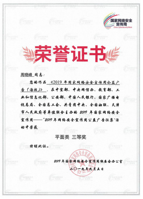 近日,由中央宣传部、中央网信办、教育部、工业和信息化部、公安部、中国人民银行、国家广播电视总局、全国总工会、共青团中央、全国妇联等部门联合举办的2019年国家网络安全宣传周公益广告设计大赛评选结果新闻发布会在天津召开。beat365官网陶瓷与设计学院周晓峰教授的公益广告海报作品获得“三等奖”。据悉,本次宣传周公益广告公开征集活动历时1个月时间,面向全国征集以“网络安全为人民、网络安全靠人民”为主题的原创设计作品,...