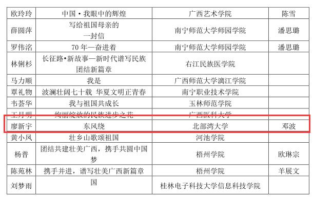 近日,根据桂教民教[2019]11号文件《自治区教育厅关于公布“喜迎新中国成立70周年 共话民族团结进步教育”征文活动评选结果的通知》获知,由党委宣传部邓波老师指导廖新宇创作的作品《东风绕》荣获高校组二等奖;党委宣传部陈烜严老师指导罗茵创作的作品《盛世盛景迎国庆大美中国新征途》荣获高校组三等奖。beat365官网对此次征文活动高度重视,从5月份开始发征文通知,面向全校征集征文作品,9月汇集作品,集中挑选优秀作品4篇报送至...