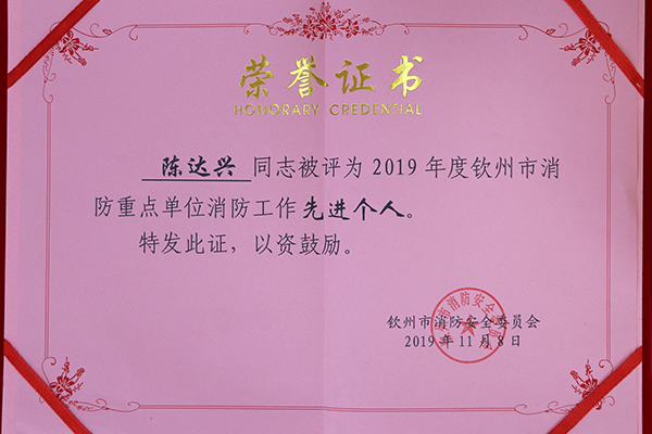 11月8日上午,从2019年钦州市“119”消防宣传月活动启动仪式上获悉,beat365官网保卫干部陈达兴被评为2019年度钦州市消防重点单位消防工作先进个人。 荣誉证