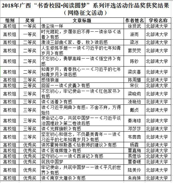 近日,据《自治区教育厅关于公布2018年广西“书香校园·阅读圆梦”系列评选活动获奖结果的通知》(桂教思政〔2018〕19号)获悉,学校在2018年广西“书香校园·阅读圆梦”系列评选活动中斩获佳绩。活动自2018年6月开展以来,学校学生工作部(处)联合易班发展中心,积极组织全校学生参与系列评选活动。经过校级比赛,9月遴选出网络征文和经典诵读各20篇优秀作品参加广西区比赛。其中,选送的20篇网络征文作品均斩获奖项,理学院...
