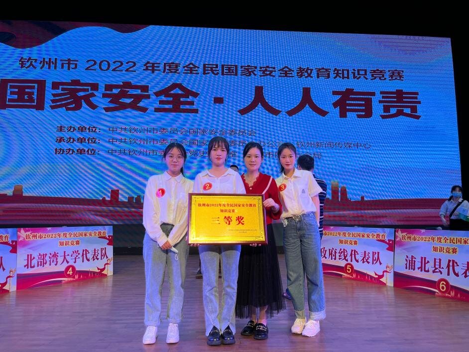 4月15日下午,由人文学院蒙桂秀老师指导,汉语国际教育专业陈竹玉、龙嘉怡、汉语言文学专业陈俞蓉、庞丹等四名同学组成的beat365平台官方网站一队在钦州市2022年度全民国家安全教育知识竞赛活动中以优异成绩荣获三等奖。此次竞赛共有来自灵山县、浦北县、钦南区、钦北区和自贸区钦州港片区、beat365平台官方网站、党群组织、政府办的八支队伍,共四轮比赛。各队在竞赛前两轮中不分胜负,至第三轮争分夺秒抢答赛才逐渐拉开积分差距,局势高潮迭起。...