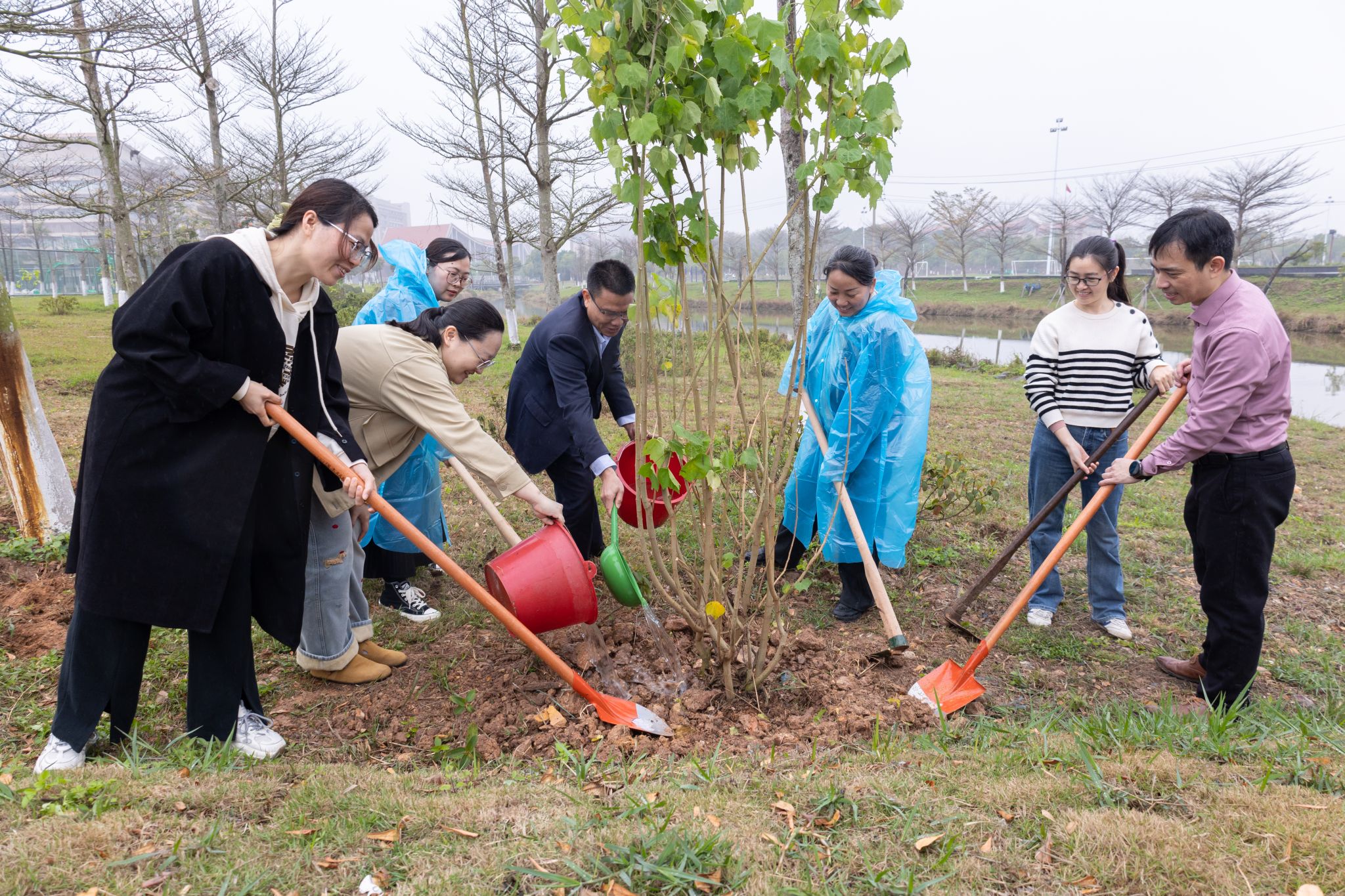 党建引领添新绿,支部共建护生态。3月12日上午,正值第47个中国植树节,组织宣传网络党支部组织全体党员前往校园东区篮球场北侧水系沿线开展“植树添绿 党员先行”主题党日活动,以实际行动力促生态文明建设,为美丽校园建设注入绿色动能。活动现场党旗飘扬,党员们身着红马甲组成"生态先锋队",大家分工协作、配合有序:有的挥锹铲土挖树坑,有的扶苗培土固根基,有的提水浇灌润新绿,现场呈现出一派热火朝天的劳动景象。参与活动的党员们纷纷表示,...