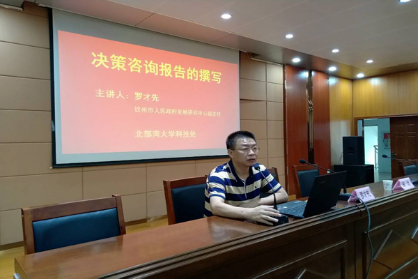 5月6日下午,科技处邀请钦州市人民政府发展研究中心副主任罗才先来校在2A—208报告厅举行题为《决策咨询报告的撰写》的专题讲座。各相关学院负责人、教师参加了讲座。讲座由科技处副处长朱念主持。罗才先副主任首先简要介绍了钦州市委、市政府开展决策咨询工作的基本情况,然后分别就什么是决策咨询、决策咨询工作有哪些特点、决策咨询报告的基本框架、如何写好决策咨询报告等问题做了阐述。他指出,一份好的决策咨询报告,首...