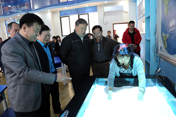 张秀隆一行实地参观考察了资环学院的地理大数据处理中心、海洋测绘实验室、无人机实验室、数字化教室,详细了解每个实验室的基本功能,观看实验室老师对设备的实地操作过程。张秀隆一行在大数据处理中心,听取资环学院院长黄远林关于项目教学的改革与实践体系的构建的汇报;在海洋测绘实验室,田义超博士就多波束、单波束、浅层剖面仪以及三维激光扫描仪的关键参数及其应用领域做了详细的汇报;在无人机实验室,梁喜幸老师讲解了关于无人机的教学方法以及在生产实际中的应用;在数字化地理教室,龙海丽博士就中国立体地形图、世界立体地形图、数字沙盘、数字星球、裸眼3D显示仪、3D打印等仪器设备做了现场演示和讲解。