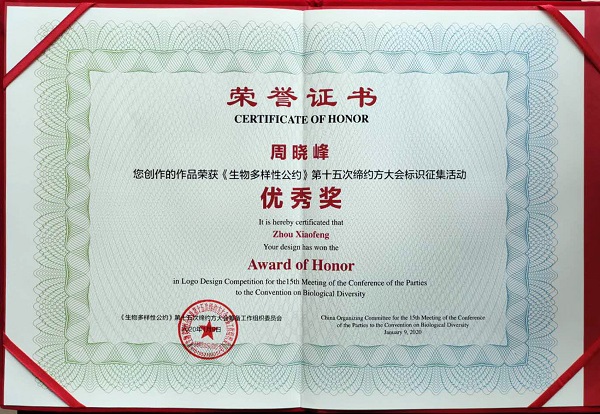 大会认为,周晓峰教授设计的标识以珍稀濒危物种大熊猫、中华鲟、朱鹮为设计元素,把绿色的植物叶片与大手紧密扣合,体现了人与自然和谐共生的基本方略和保护生物多样性、共建人类命运共同体的COP15大会理念和愿景,体现了生物多样性和文化多样性,契合大会主题“生态文明,共建地球生命共同体”。