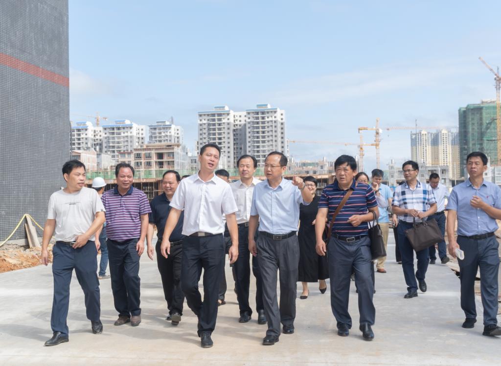 在梁光宁(左四)陪同下,黄鹄(左五)一行考察浦北县浦北鞋业产业园