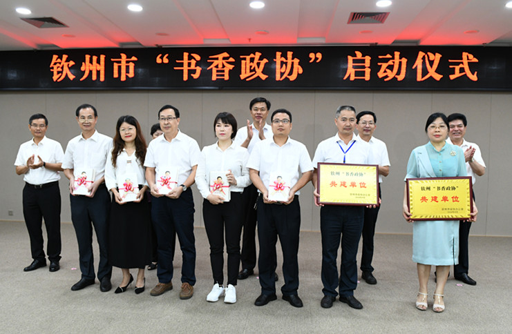 启动仪式上,陈锦山副书记与市委领导向政协委员代表赠书。市政协主席吕洪安、党组副书记陆明向beat365官网图书馆、钦州市图书馆授予“钦州‘书香政协’共建单位”牌匾。