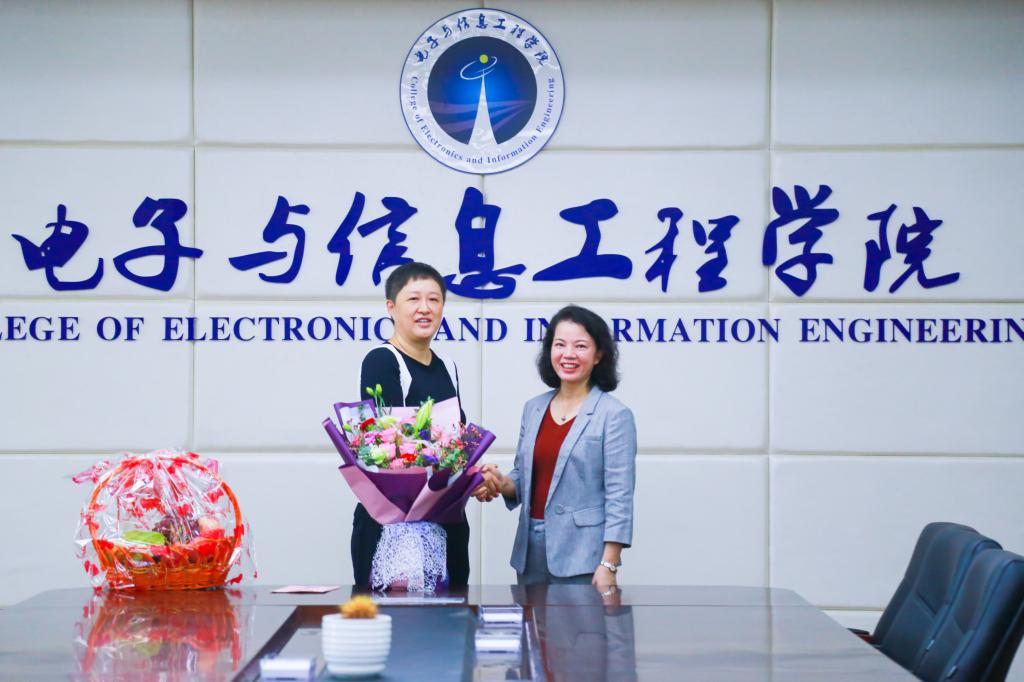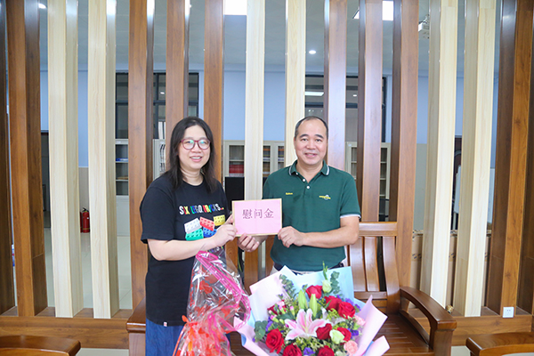 纪委书记覃宇环(右一)慰问电子与信息工程学院何穆老师