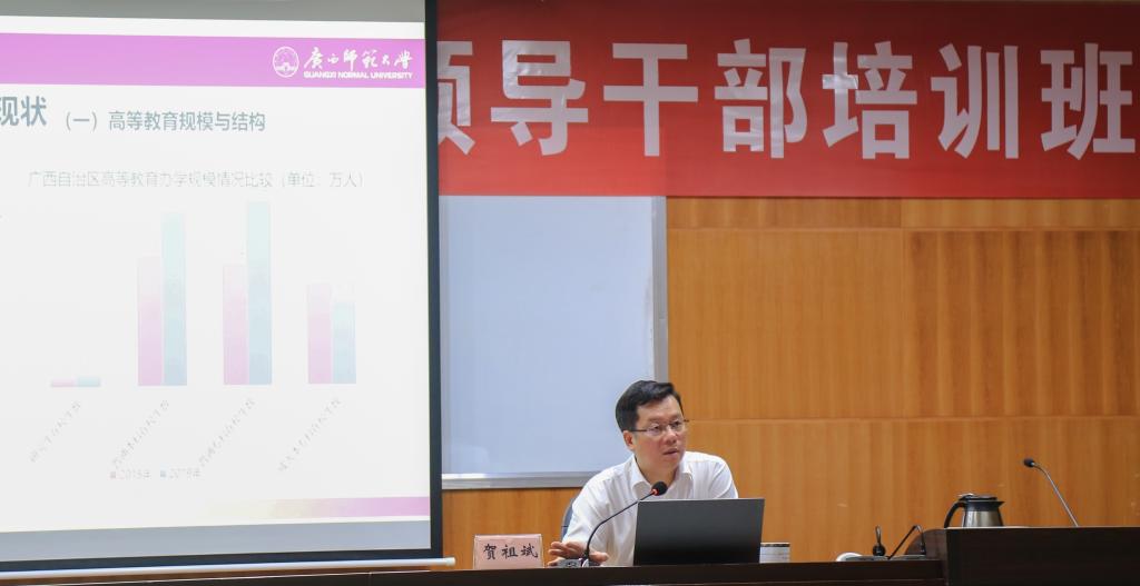 25日下午,广西师范大学党委副书记、校长贺祖斌教授受邀主讲《高等教育形式分析》。贺教授以大学治理理论为背景,深入浅出地分析了广西高等教育治理现状与问题,对大学治理实践案例进行了探讨。他强调,高等教育从“管理”走向“治理”是社会管理变革的必然要求,高校要加快推进高等教育治理体系和治理能力现代化,提高教育法治化水平和学校自主管理能力。最后,贺教授以广西师范大学为例,着重介绍了在推进治理体系和治理能力现代化过程中,健全学校高质量发展的“十大制度体系”。