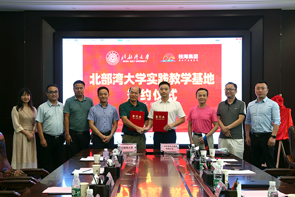 人文学院院长莫华善和广西桂海实业集团总经理王余签署战略合作框架协议,陈湘如副书记和王余总经理为实践教学基地揭牌。