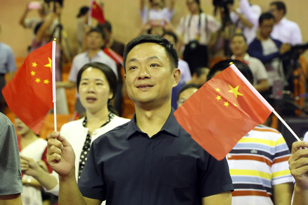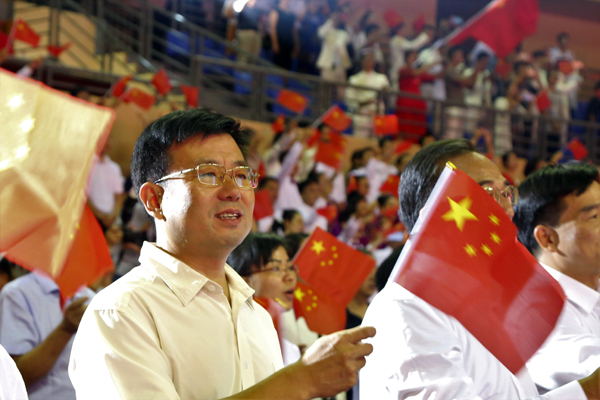晚会最后,由beat365官网代表队领唱《我和我的祖国》带动全场大合唱,将晚会气氛推向最高潮。(杨君兰 摄)