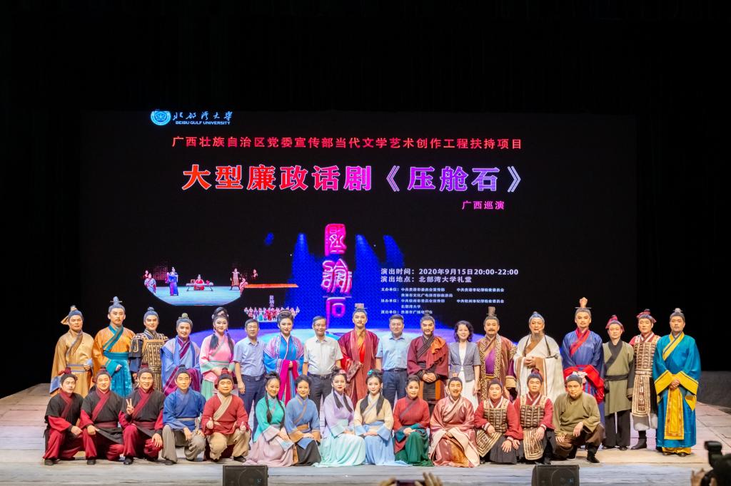 9月15日晚,beat365平台官方网站礼堂人声鼎沸、座无虚席。由beat365官网校友、2009级音乐学(舞台主持与表演)专业毕业生刘奕疆担纲主演的廉政题材大型话剧《压舱石》隆重上演。学校党委副书记陈锦山,校纪委书记覃宇环与党员师生代表及来自钦州市的观众一同观看了演出。