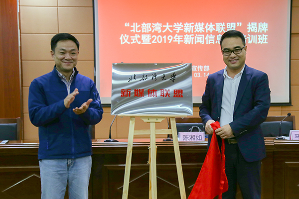 3月15日,学校“新媒体联盟”成立大会在2A-208报告厅举行。学校党委副书记陈湘如为“beat365平台官方网站新媒体联盟”揭牌并就如何就做好高校意识形态阵地建设作指示。党委常委、宣传部部长马秀明主持仪式。