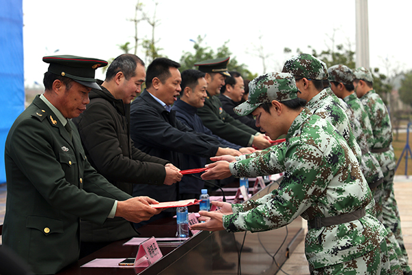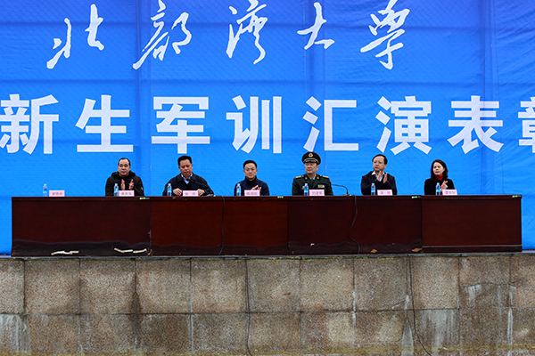 在主席台就坐的学校党委副书记陈湘如,学校副校长曾彦、黄鹄、唐高华,纪委书记覃宇环,中国人民解放军钦州军分区副司令员刘建军,广西绿邦国防教育训练基地副主任谢晓丹与各二级学院的领导老师们一起感受了湾大学子在寒风中飞扬的青春气息。