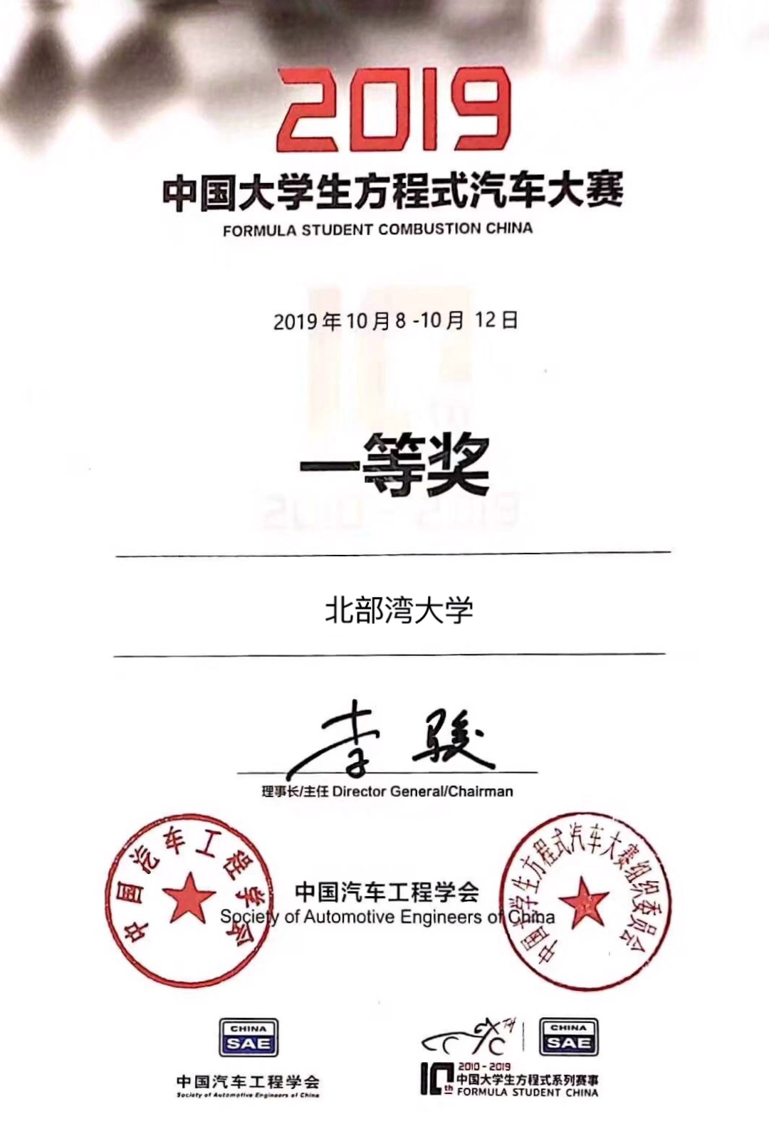 10月12日,由中国汽车工程学会主办的2019中国大学生方程式汽车大赛暨中国大学生方程式系列赛事十周年在湖北襄阳市梦想方程式赛场取得圆满成功。beat365官网FLYERS车队在与同济大学、吉林大学、北京交通大学、上海交通大学等70余所本科高校同台竞技中,以总成绩710.25分,全国第8名的成绩获得全国一等奖,成绩创历史新高。