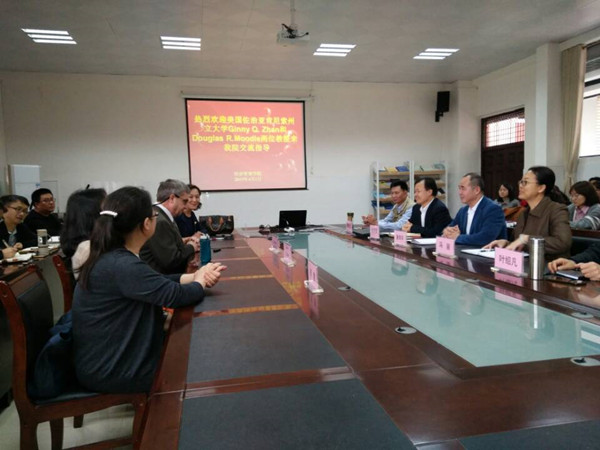 Douglas R.Moodie教授详细介绍了美国佐治亚肯尼索州立大学及其商学院的专业设置、学校排名、研究中心、发展计划等基本情况,并初步列出了一些合作选项。Ginny Q. Zhan教授做了《大学教师心理健康》的讲座,并为促进大学教师身心健康给出了一些建议。