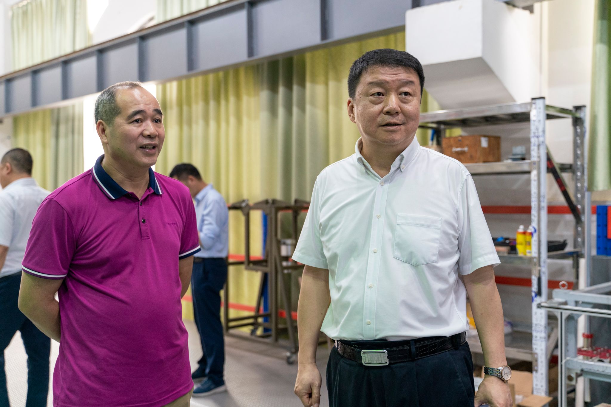 陈锐书记(右)参观机船学院水槽动力系统,唐高华副书记(左)陪同