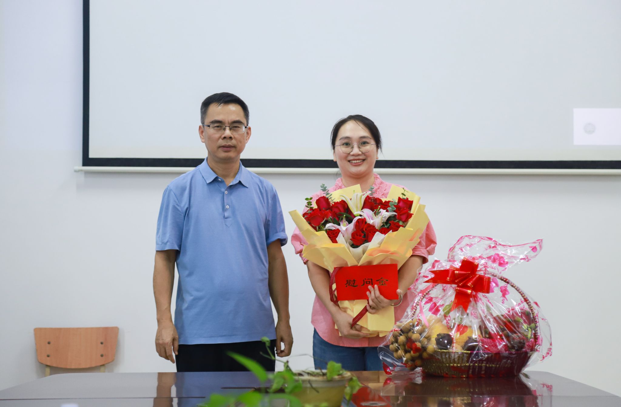 校党委副书记唐高华(左)看望慰问外国语学院一线教师代表