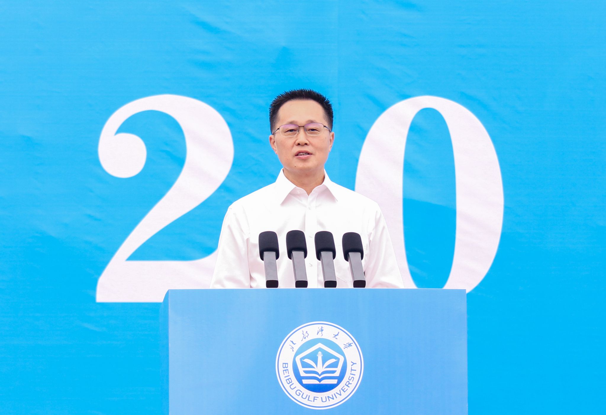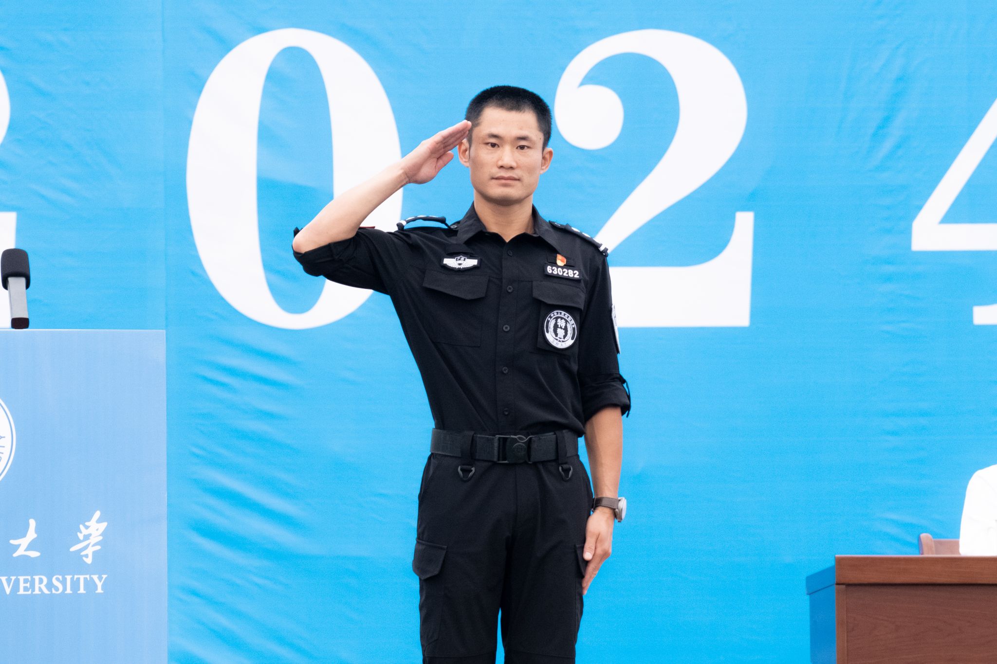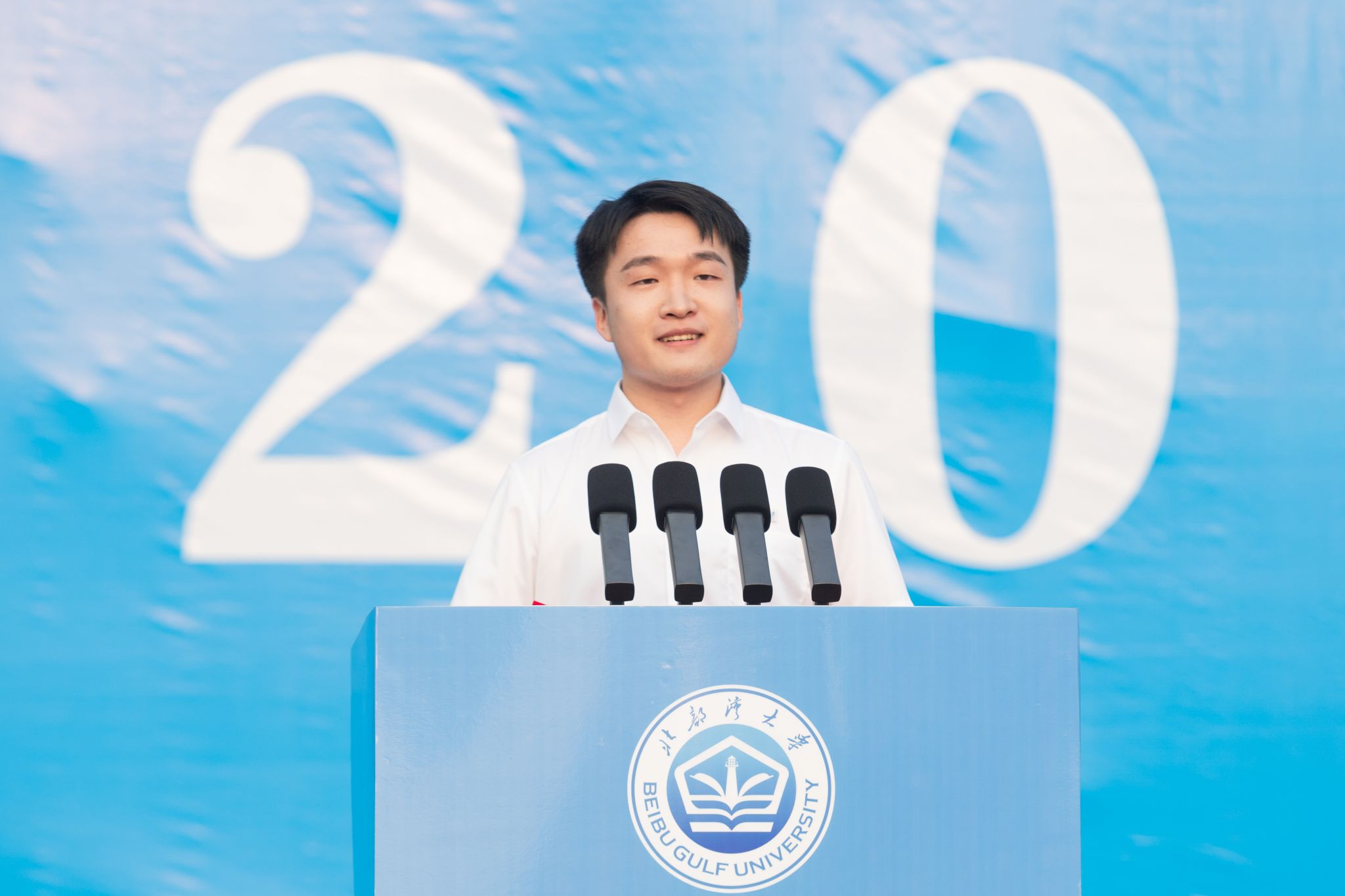 校友代表、自治区优秀特警、钦州市公安局陆槟谋分享了自己奋斗求学的心路历程,并感恩母校教育。他寄语新生勇攀高峰、持续进步、铭记校训、担当使命。