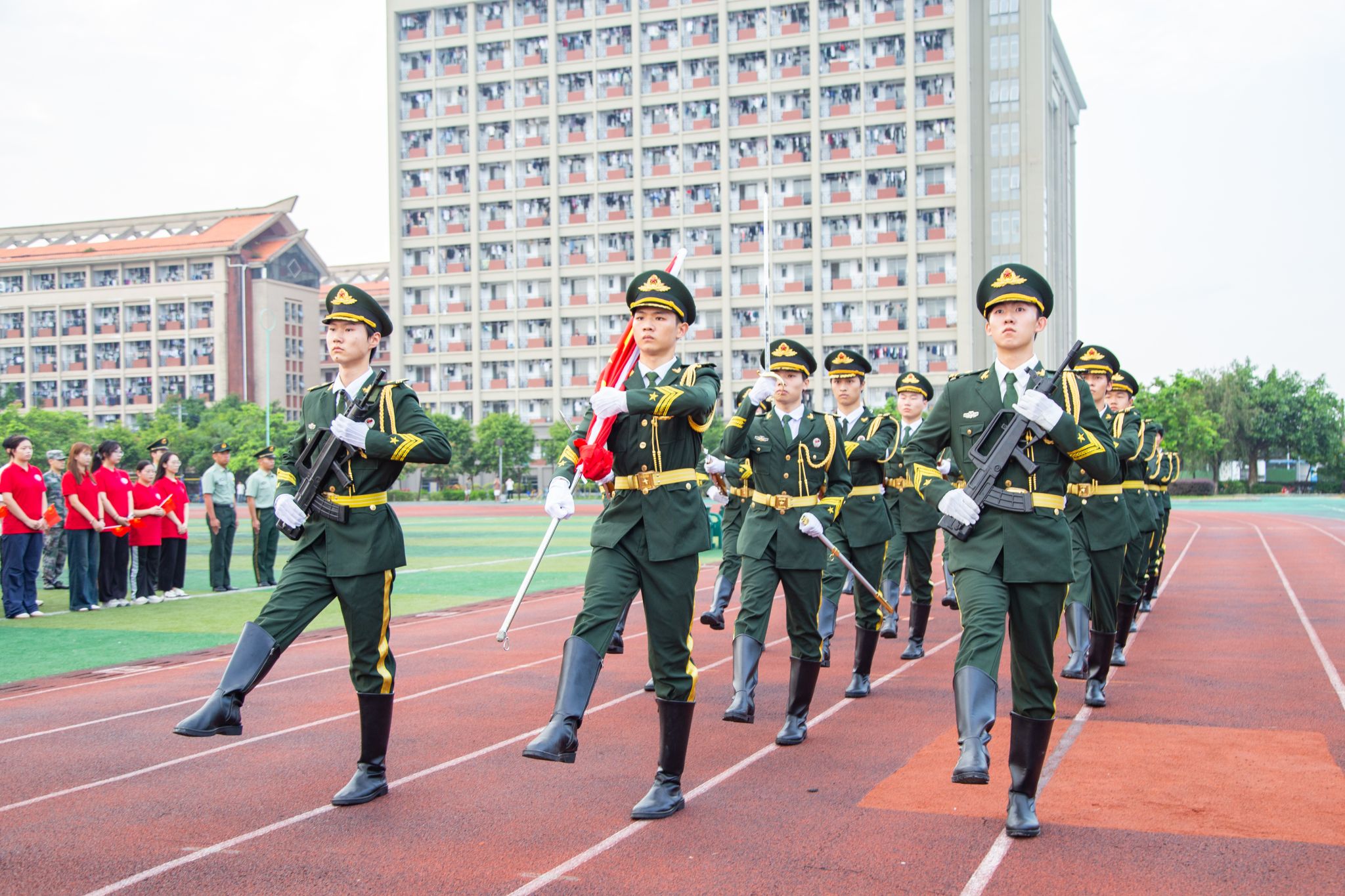 国旗护卫队护卫五星红旗向升旗台迈进