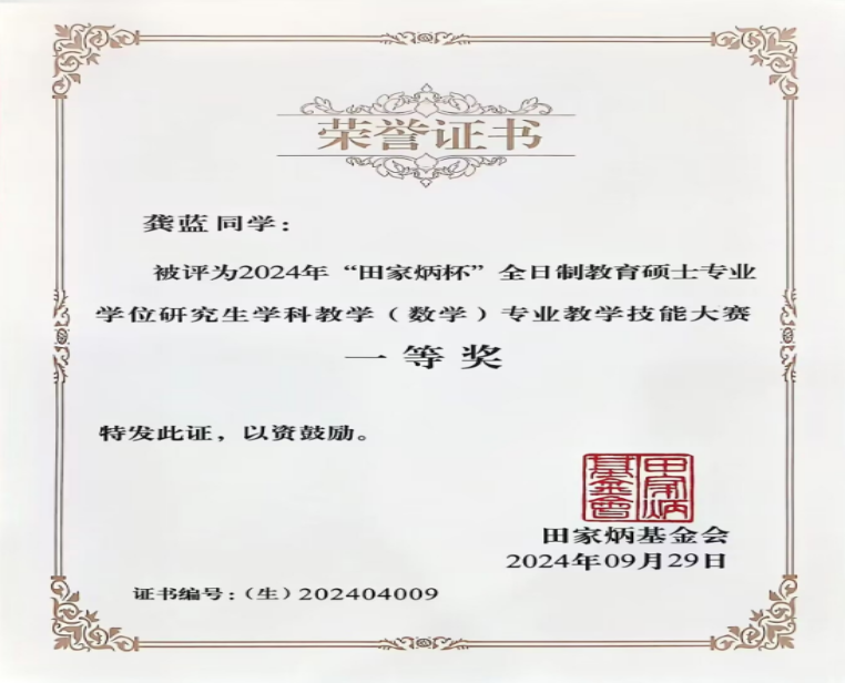 9月27日至30日,2024年全国“田家炳杯”全日制教育硕士专业学位研究生学科教学(数学)专业教学技能大赛决赛暨数学教师教育实践创新论坛在上海交通大学举办。beat365官网师生首次参加全国决赛,来自理学院2023级学科教学(数学)教育硕士龚蓝在比赛中脱颖而出获得全国一等奖,其导师梁好翠获优秀指导老师荣誉称号。