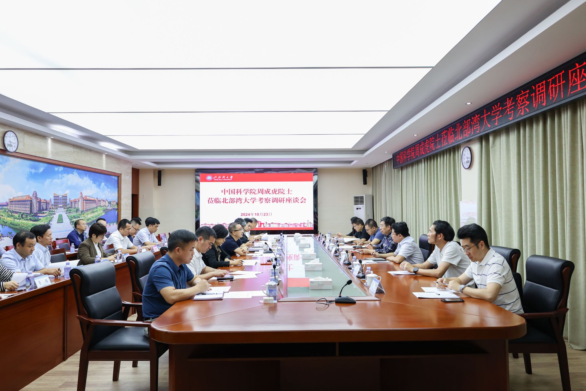 广东省科学院、广西农科院、广西海洋环境监测中心站、广州中科云图智能科技有限公司及钦州市科技局、钦州市大数据发展局主要负责人,学校党校办、科技处、海洋学院、机械与船舶海洋工程学院、电子与信息工程学院、资源与环境学院、理学院、经济管理学院相关负责人参加调研交流。(施冰冰 摄)