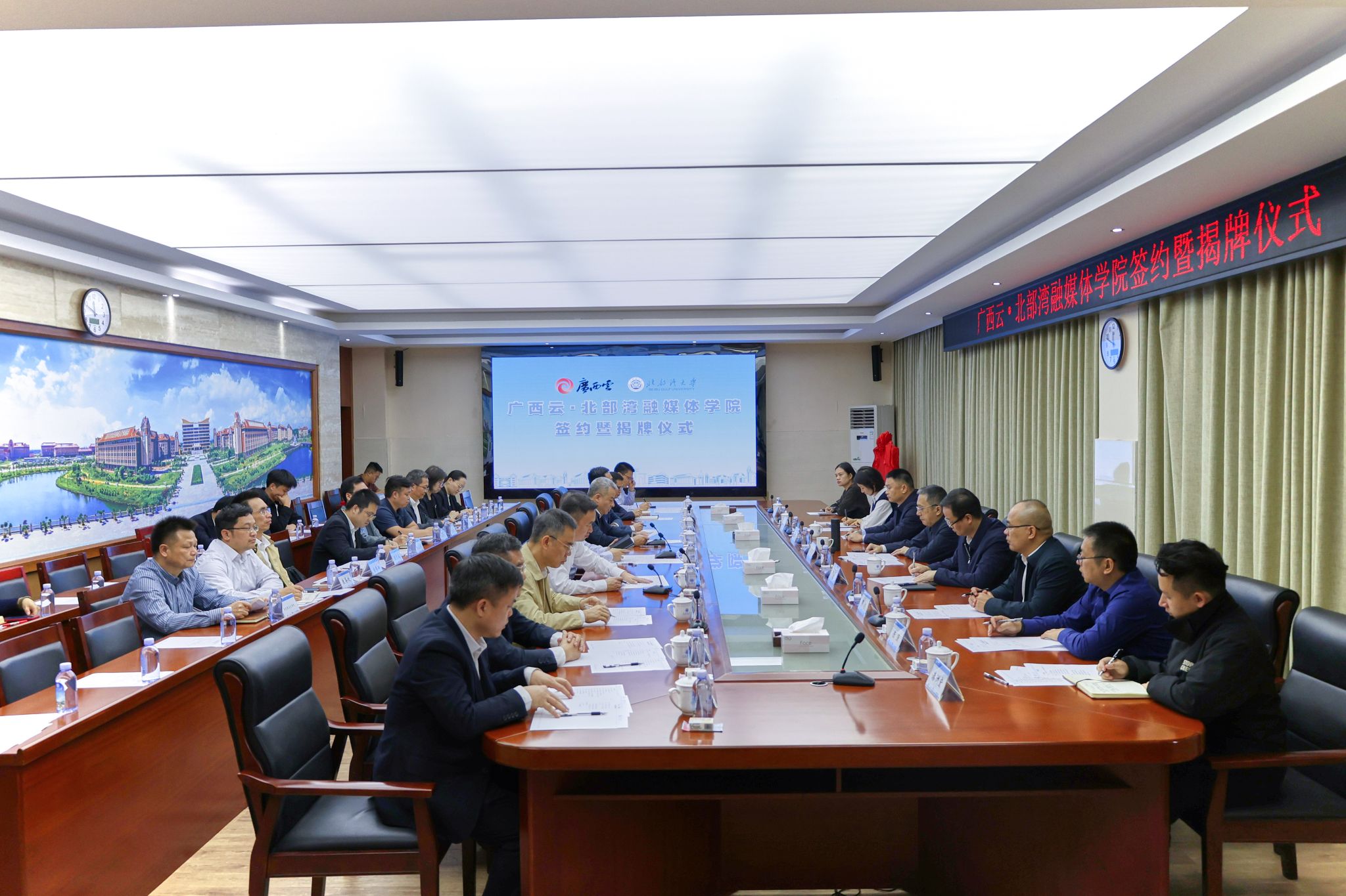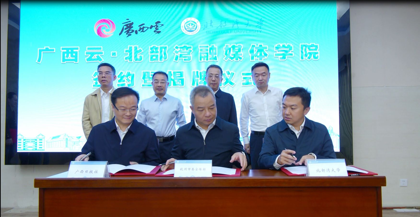 10月29日上午,由中共钦州市委员会宣传部、beat365平台官方网站、广西日报社共建的桂南地区首个融媒体学院,广西云·北部湾融媒体学院在学校揭牌成立。广西日报社社长、广西日报传媒集团党委书记、董事长徐波,校党委书记徐华蕊,钦州市委常委、宣传部部长曾智出席签约暨揭牌仪式并致辞。校党委副书记、校长苗剑主持仪式。广西日报社副总编辑阳天,校党委副书记陈磊,自治区纪委监委驻beat365平台官方网站纪检监察组组长、校党委常委、纪委书记谢立平出席仪式。