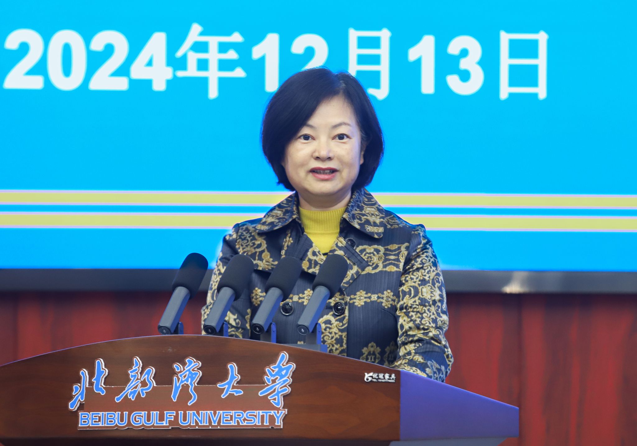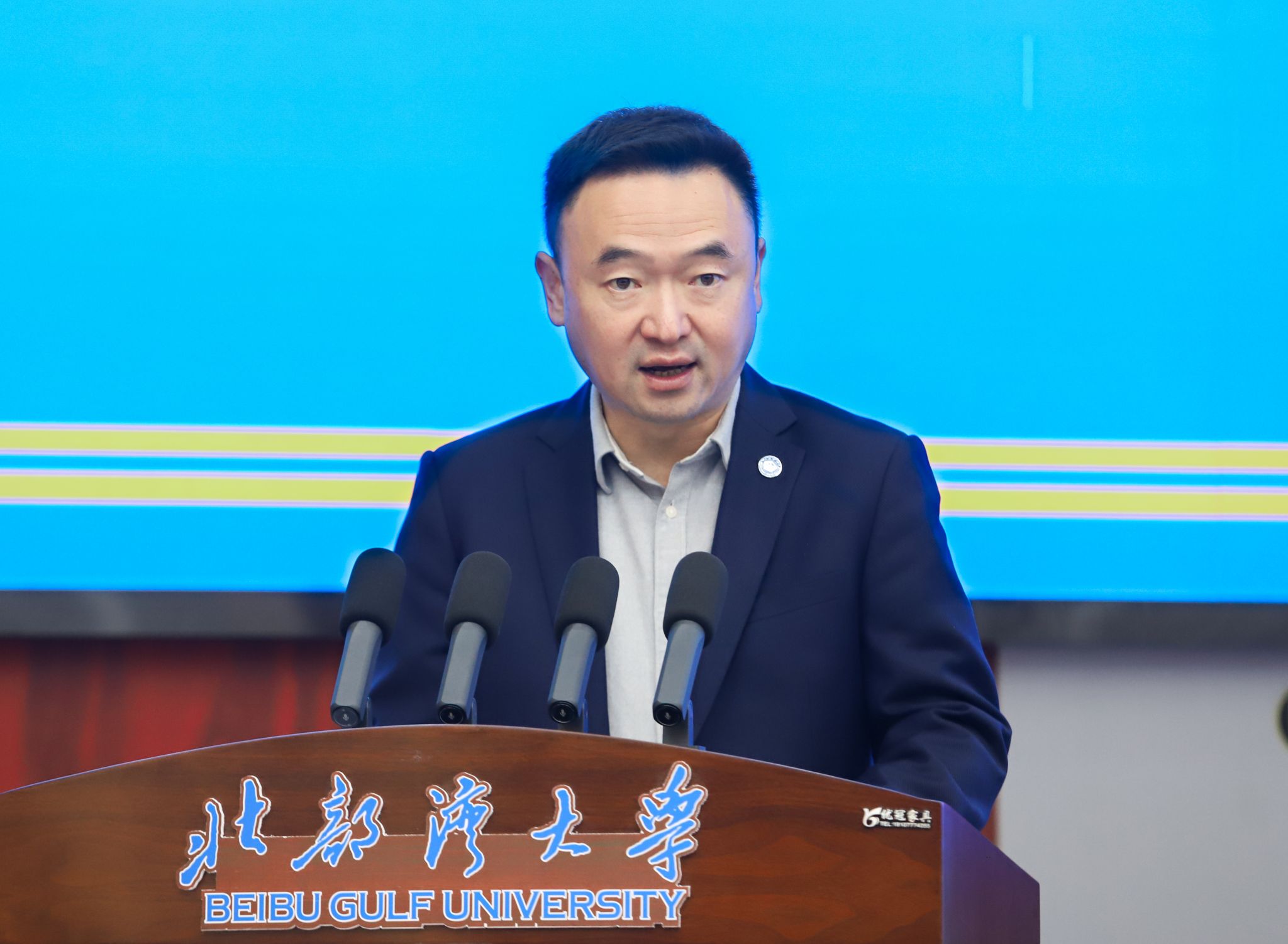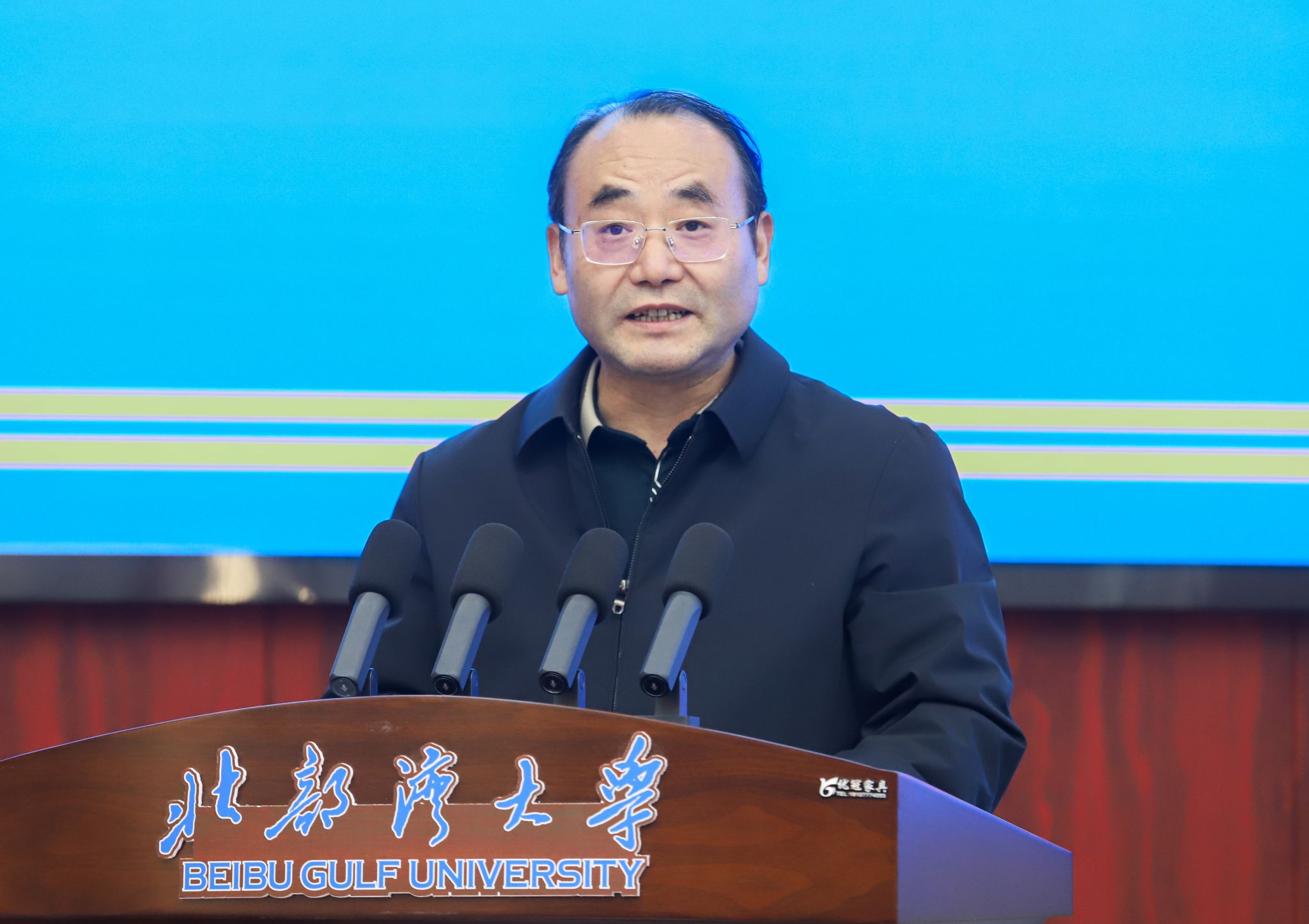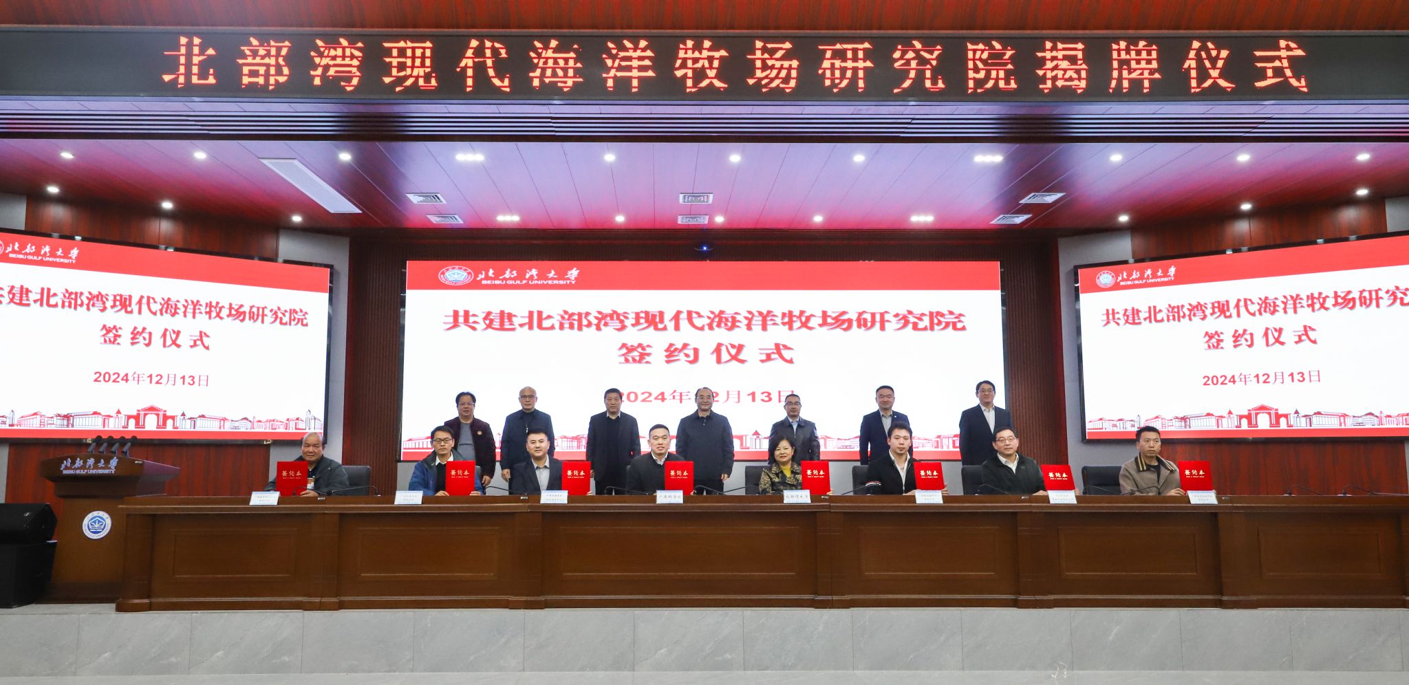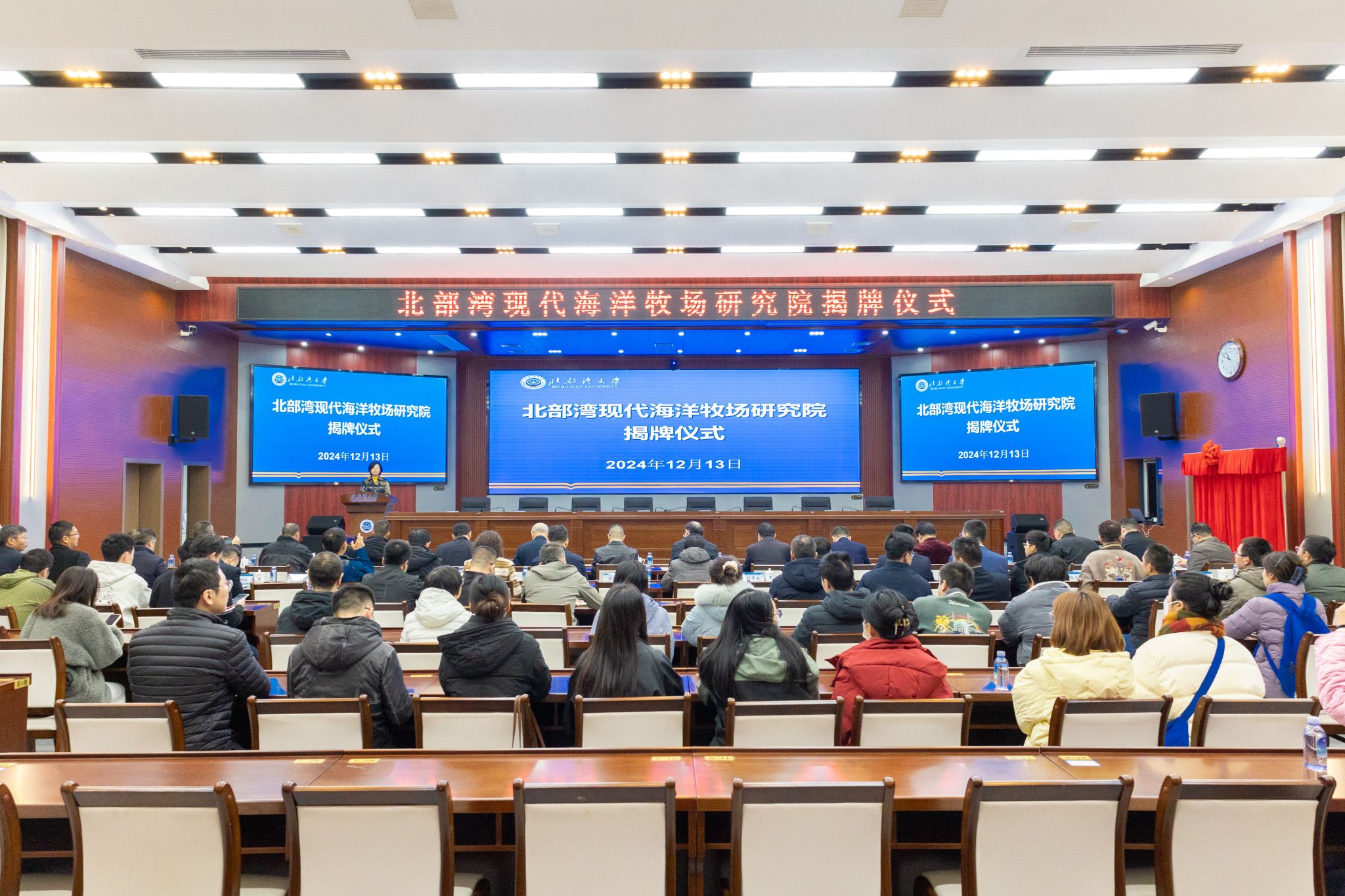 12月13日,北部湾现代海洋牧场研究院在beat365官网办公楼一楼报告厅揭牌。自治区海洋局党组成员、副局长宁向军,广西科学院党组书记、院长元昌安,中国铁建股份有限公司首席专家任少强,中国船舶集团广西造船有限公司总经理张新龙,广西-东盟海洋产业发展联盟主席彭建华,校党委书记徐华蕊,校党委副书记、校长苗剑出席揭牌仪式。校党委常委、副校长陈丹主持。苗剑、宁向军、元昌安、张新龙致辞。