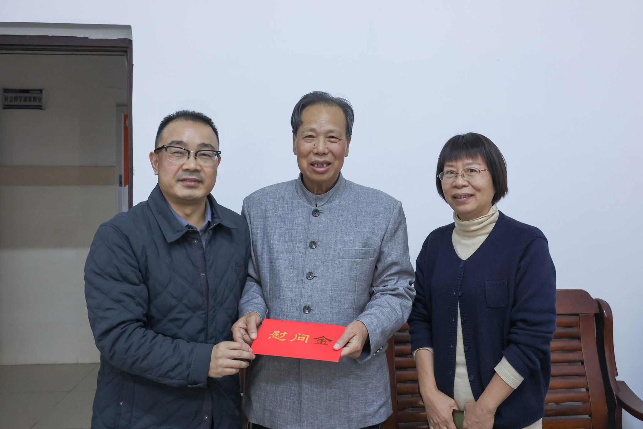 徐华蕊书记(左)、陆衡副校长(右)慰问老党员黄家庆同志(中)