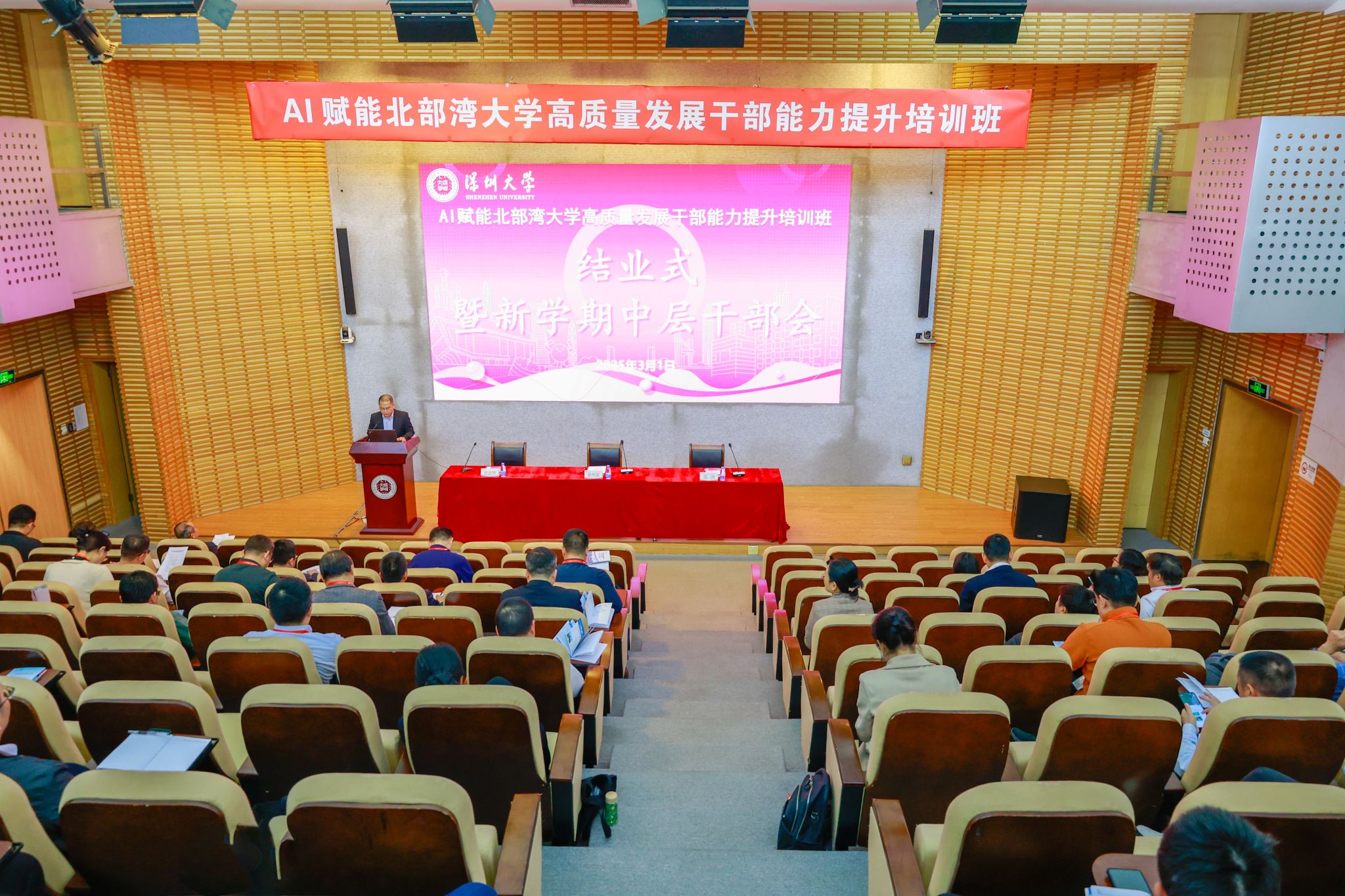 3月1日上午,AI赋能beat365平台官方网站高质量发展干部能力提升培训班结业仪式暨中层干部会议在深圳大学粤海校区汇星楼一楼二号报告厅举行。校领导徐华蕊、苗剑、唐高华、陈磊、陆衡、马秀明、陈丹及全体中层干部、优秀教师代表参会。学校党委副书记唐高华主持。