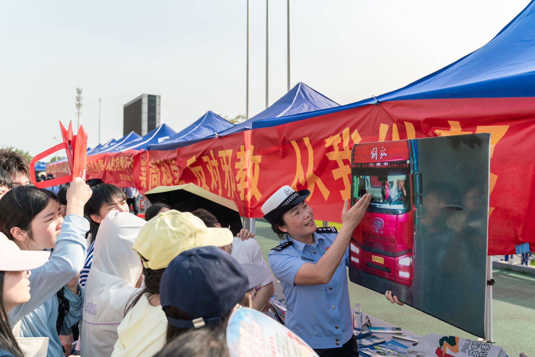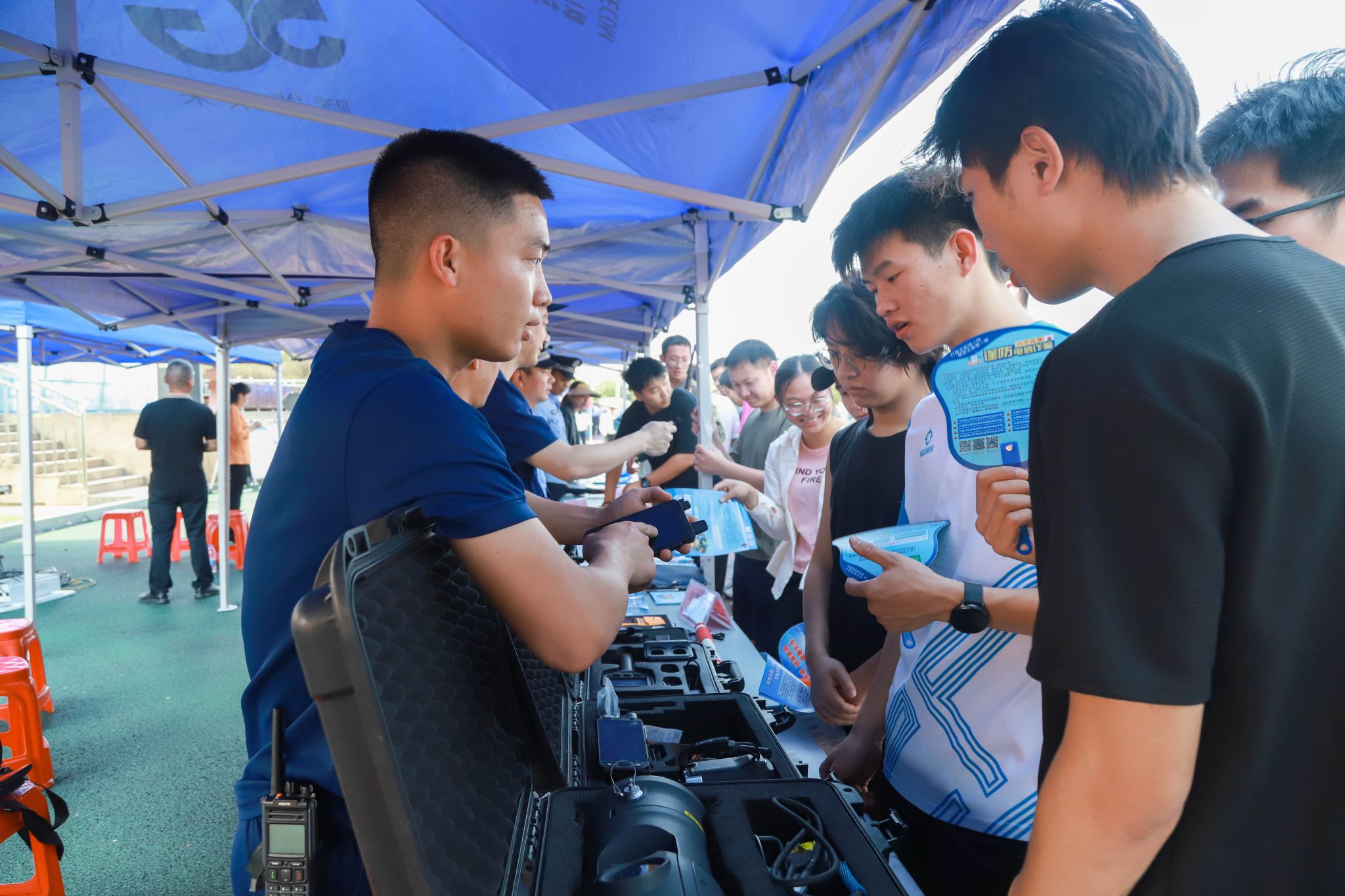 活动现场设置国家安全教育主题展区。针对大学生群体特点,通过案例剖析、实景演示等形式,系统呈现网络安全等领域防护要点。结合“冒充公检法”“刷单返利”等校园高发电信诈骗案例,解析新型诈骗手段,传授个人信息防护技巧。科普《中华人民共和国反间谍法》与邪教组织辨识方法。在装备展示区,警用无人机、排爆机器人、应急救援器材等装备亮相,现场演示热成像搜救、可疑物品处置等专业化操作流程,展现现代化安防技术在反恐处突中的应用效能。
